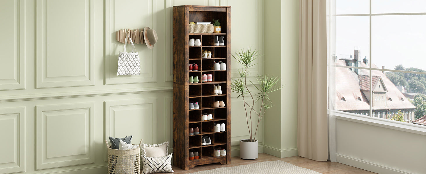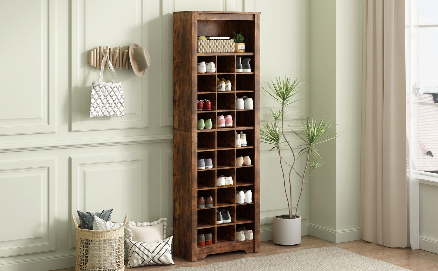 ON-TREND Stylish Design 30 Shoe Cubby Console, Contemporary Shoe Cabinet with Multiple Storage Capacity, Free Standing Tall Cabinet with Versatile Use for Hallway, Bedroom, Rustic Brown