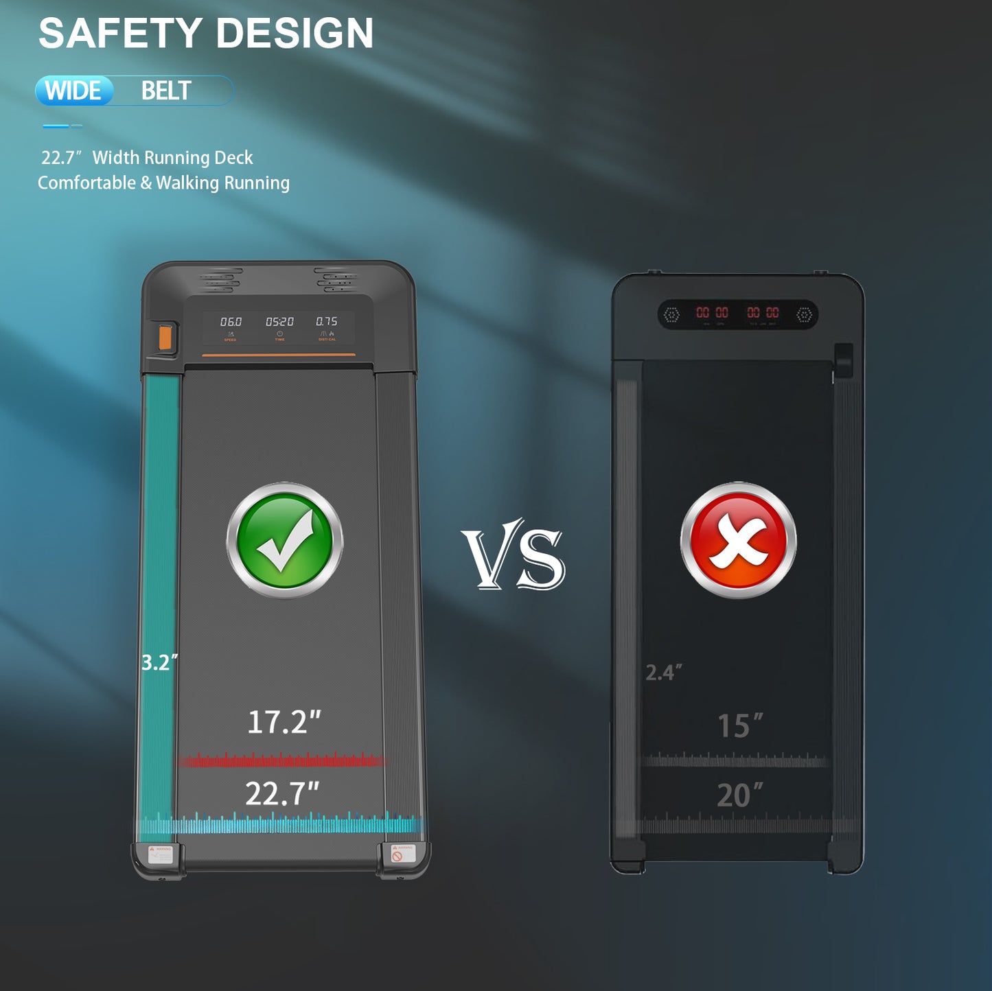 - Different from some small treadmills, Keyfit under desk treadmill is equipped with a pair of wider side-rails (3.2” in width), that provides the anti-slip safety stripes for standing on the treadmill deck when the users stop workouts temporarily or instantly.