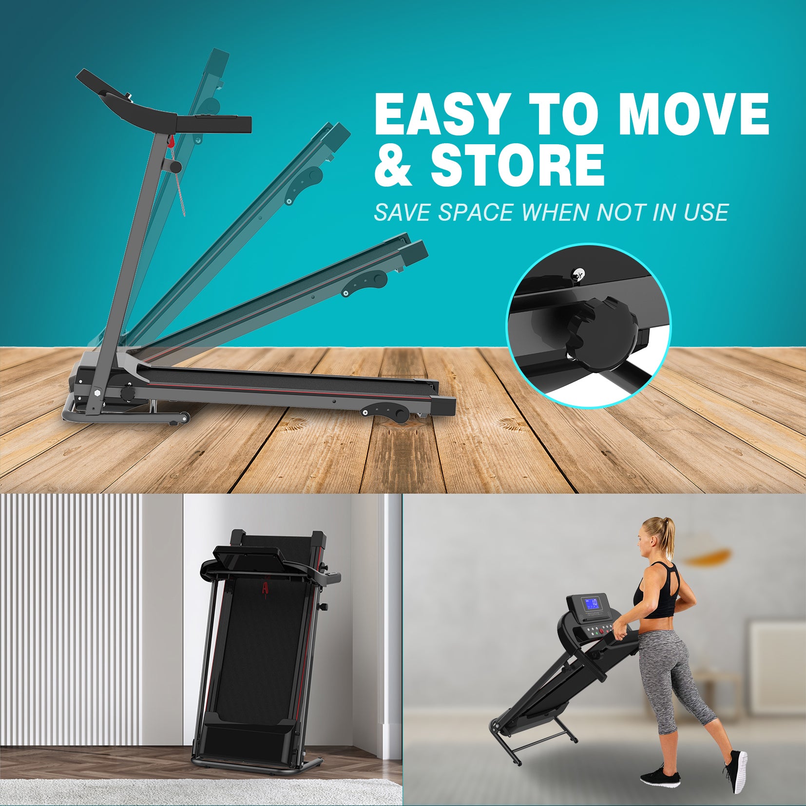 - 2.FOLDABLE DESIGN: With compact assembled dimensions of 51.2" x 46.5" x 25.6"" and Folded dimensions of 23.4" x 25.6" x 49.2", our Foldable Treadmill is perfect for small spaces. You can fold it and store it easily when not in use.