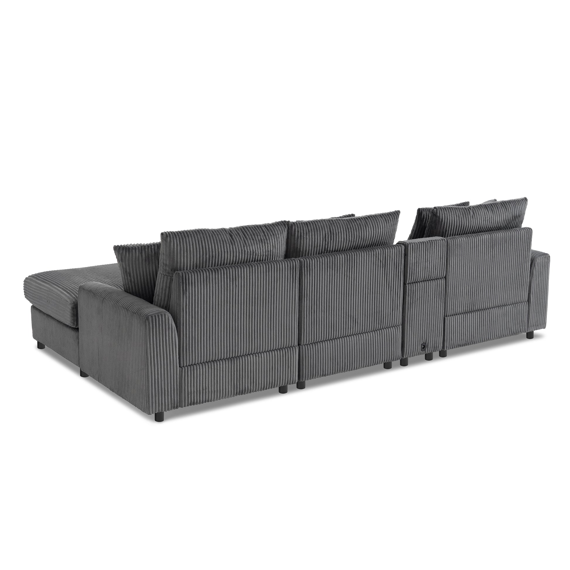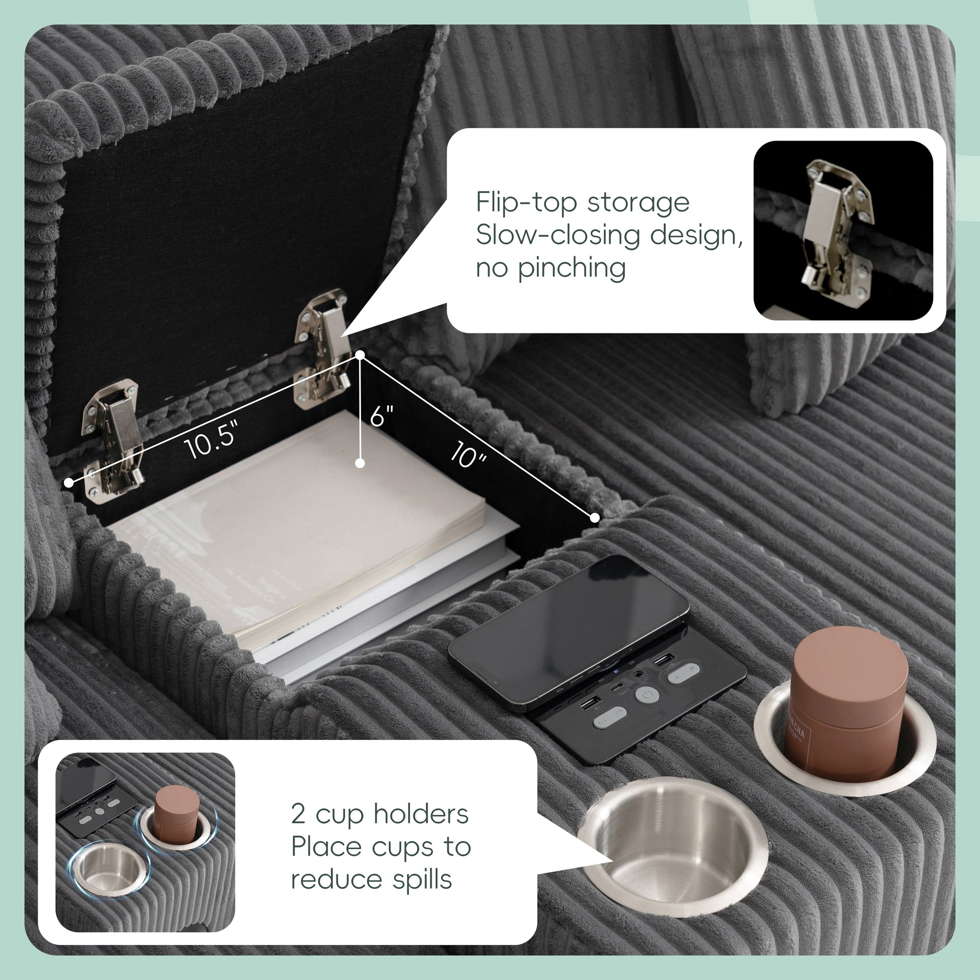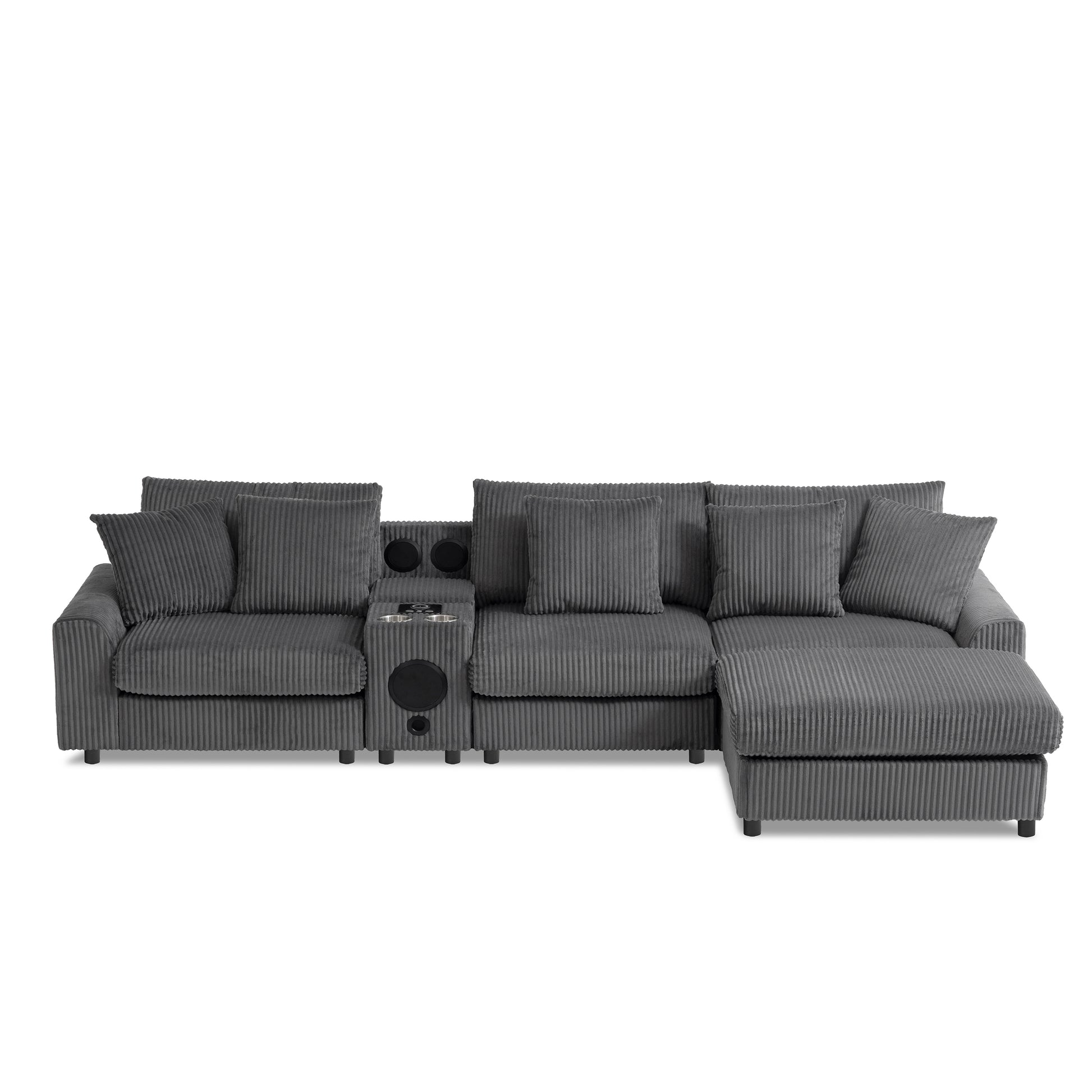[SantaChoice] 114*64'' Corduroy Sectional Sofa with Bluetooth Speakers,L Shaped Couch with Console,USB Charger,Cup Holders,Storage,Ottoman,Deep and Wide Seat Cloud Sofa for Living Room,Apartment,2 Colors