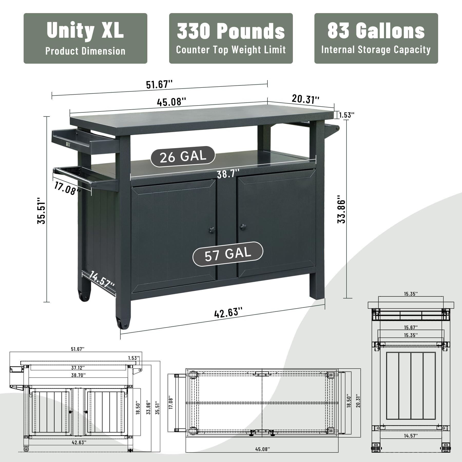 - Ample Storage Spaces- The outdoor dining cart contains 2-tier shelf for more storage. This outdoor grill table includes 57 gallons of interior storage & 26 gallons of open storage for a total of 83 gallons of storage capacity.