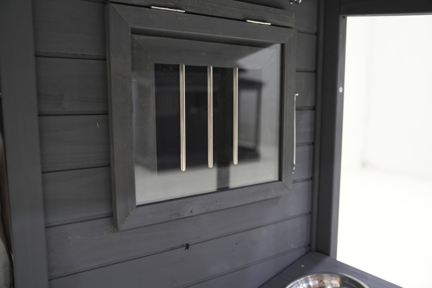 - 1.The spacious terrace of this large dog house offers plenty of space for your furry friend to observe the world or relax. Even on rainy days, the linoleum waterproof roof is thermally insulated, allowing your dog to play freely and stay dry