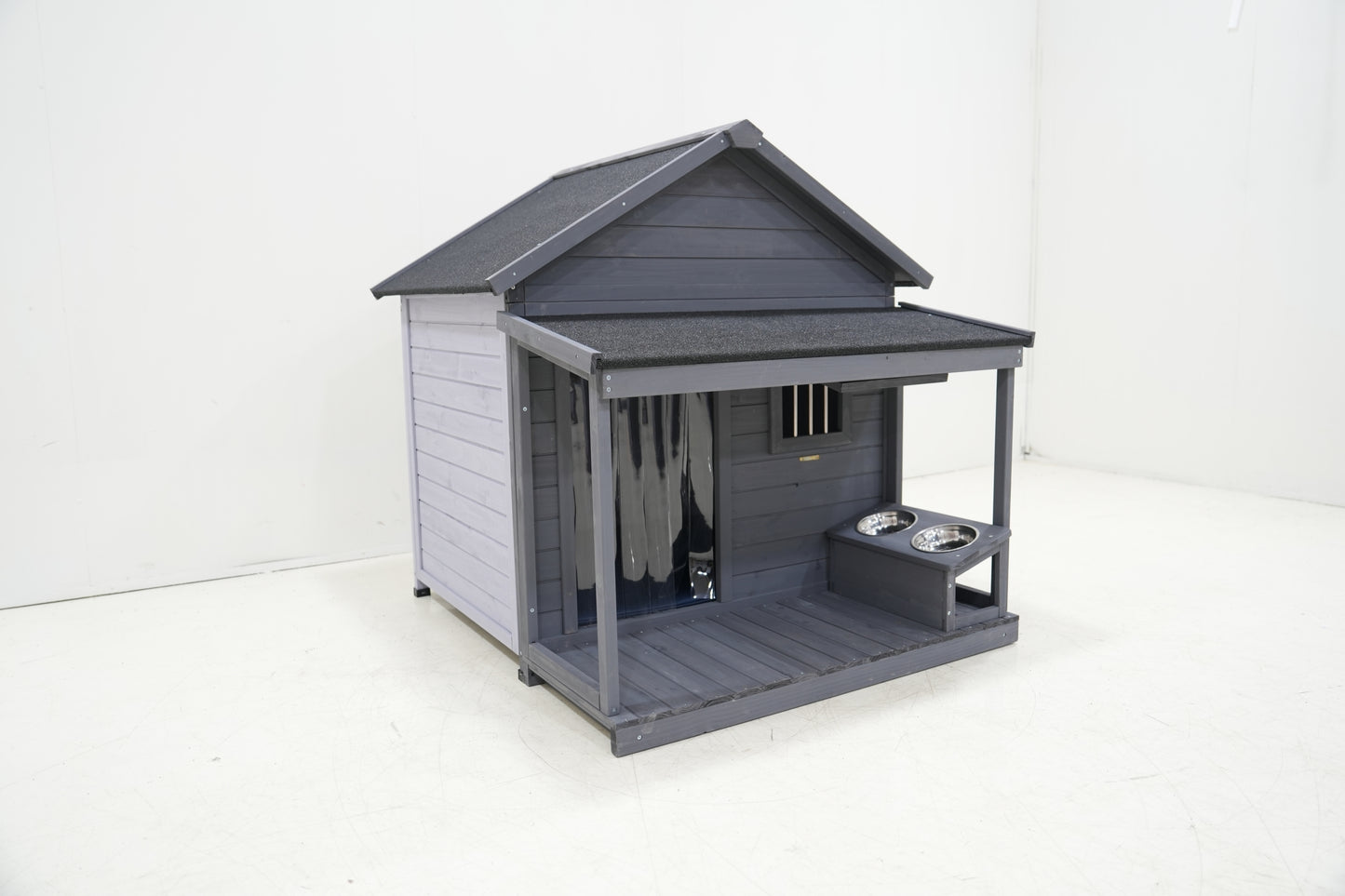 Large balcony dog house, length 44.2" x width 44.6 "x height 44.6" Solid wood asphalt roof dog house with large terrace, weatherproof large dog house, cleaning mat, feeding bowl
