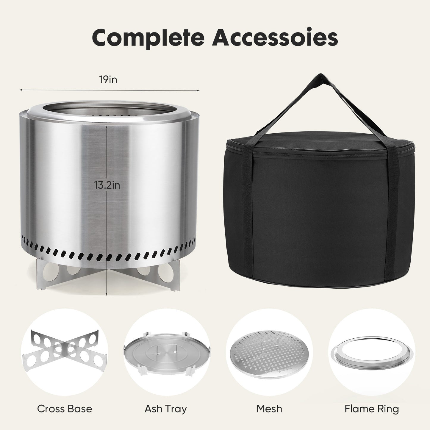 - Portable Outdoor Firepit:This smokeless wood/pellets burning stainless steel fire pit is your gateway to hassle-free outdoor enjoyment anywhere you go. Ideal for patios, backyards, balconies, camping trips, RVs, or tailgates, it’s designed for convenience and portability. The compact size (19" x19") and included carrying bag make it easy to transport and set up wherever you are.