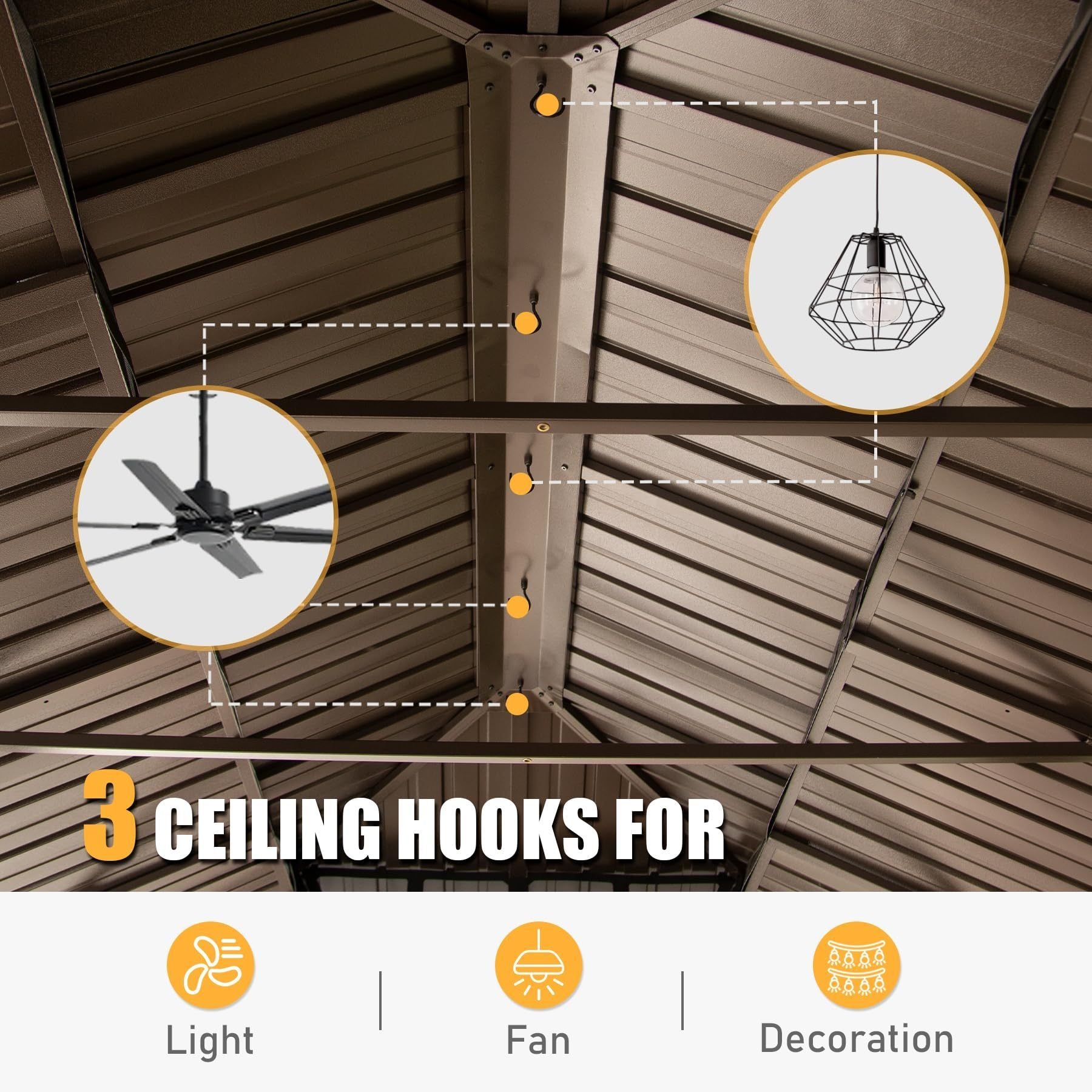 - Fade and Rust Resistance- The galvanized steel metal top is fade-resistant and rust-resistant, prolonging the life of the aluminum gazebo.