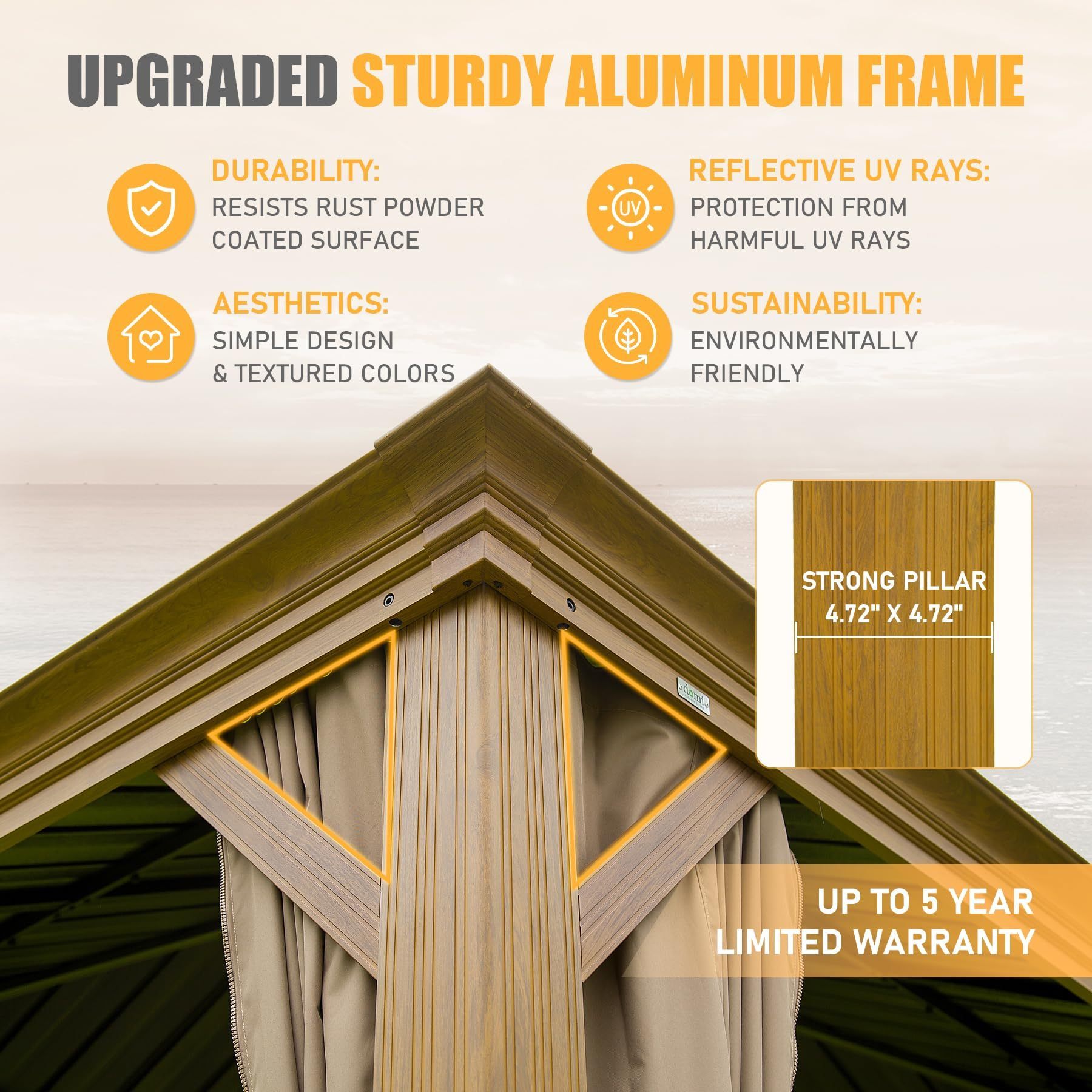 - Realistic Wood Grain Finish- The 14x20FT hardtop gazebo features a stunning wood grain transfer print, giving it an authentic and natural look.