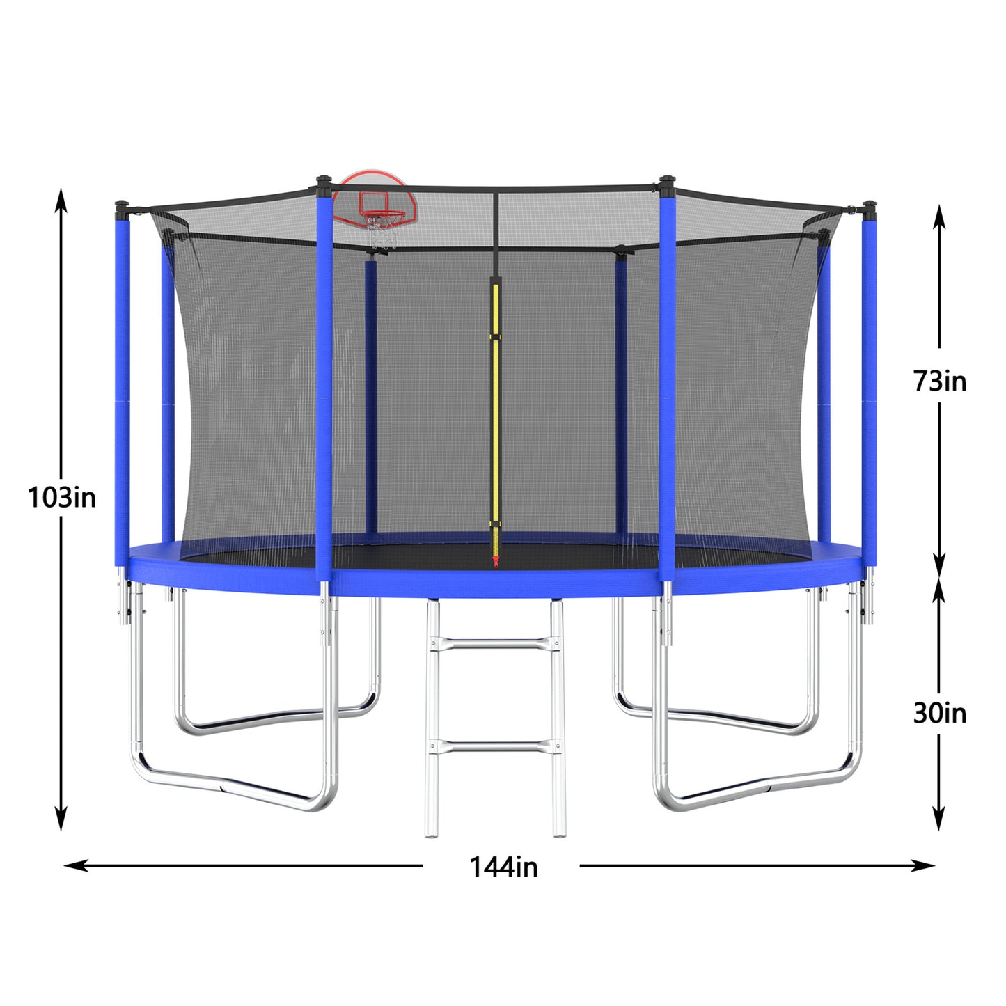 - 12 FT Trampoline is equipt with 8 high safety enclosure poles and heavy gauge galvanized rust resistance steel construction. 4 W-shaped legs secure stability. For the safety of every user, we have ensured that our recreational trampoline meets ASTM and CPC standard safety specifications