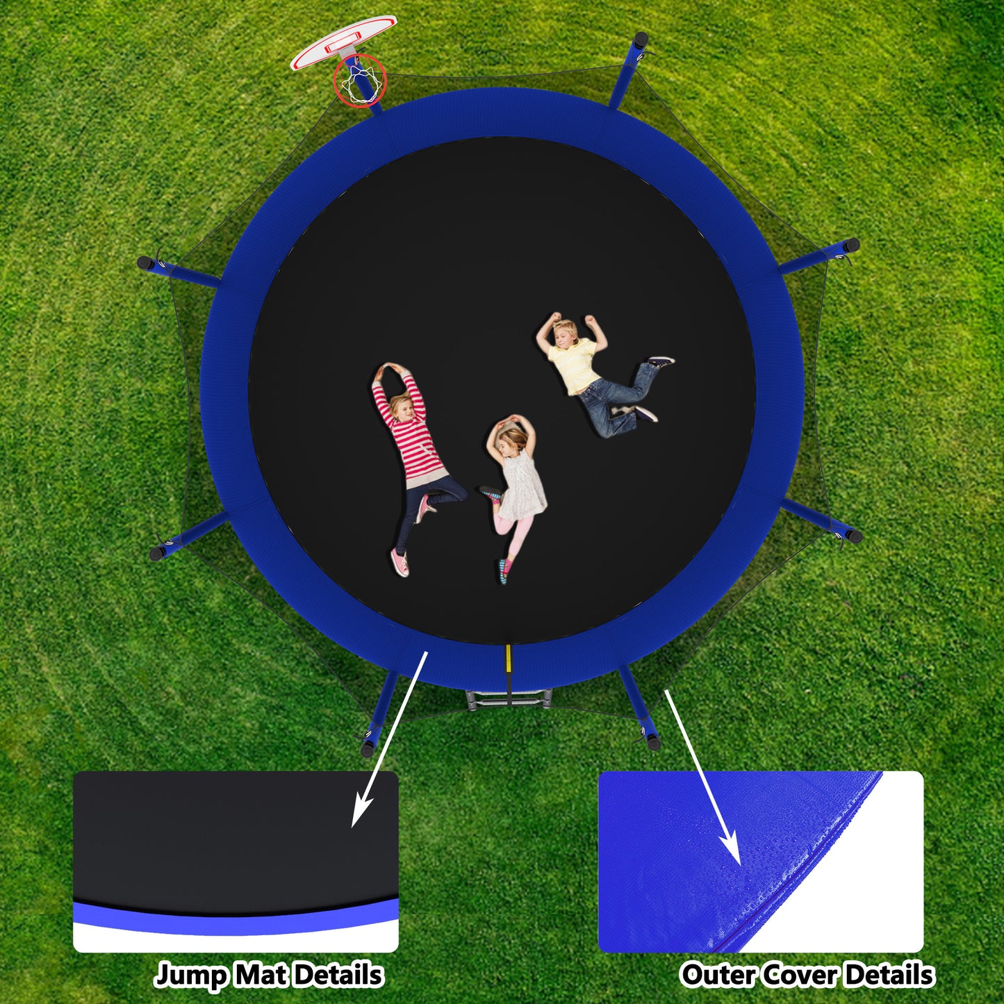 - 8 foam padded poles to support UV-proof safety trampoline enclosure net for maximum safety while jumping. Heavy duty 2-step galvanized steel ladder offers convenient maneuverability in and out of the trampoline.