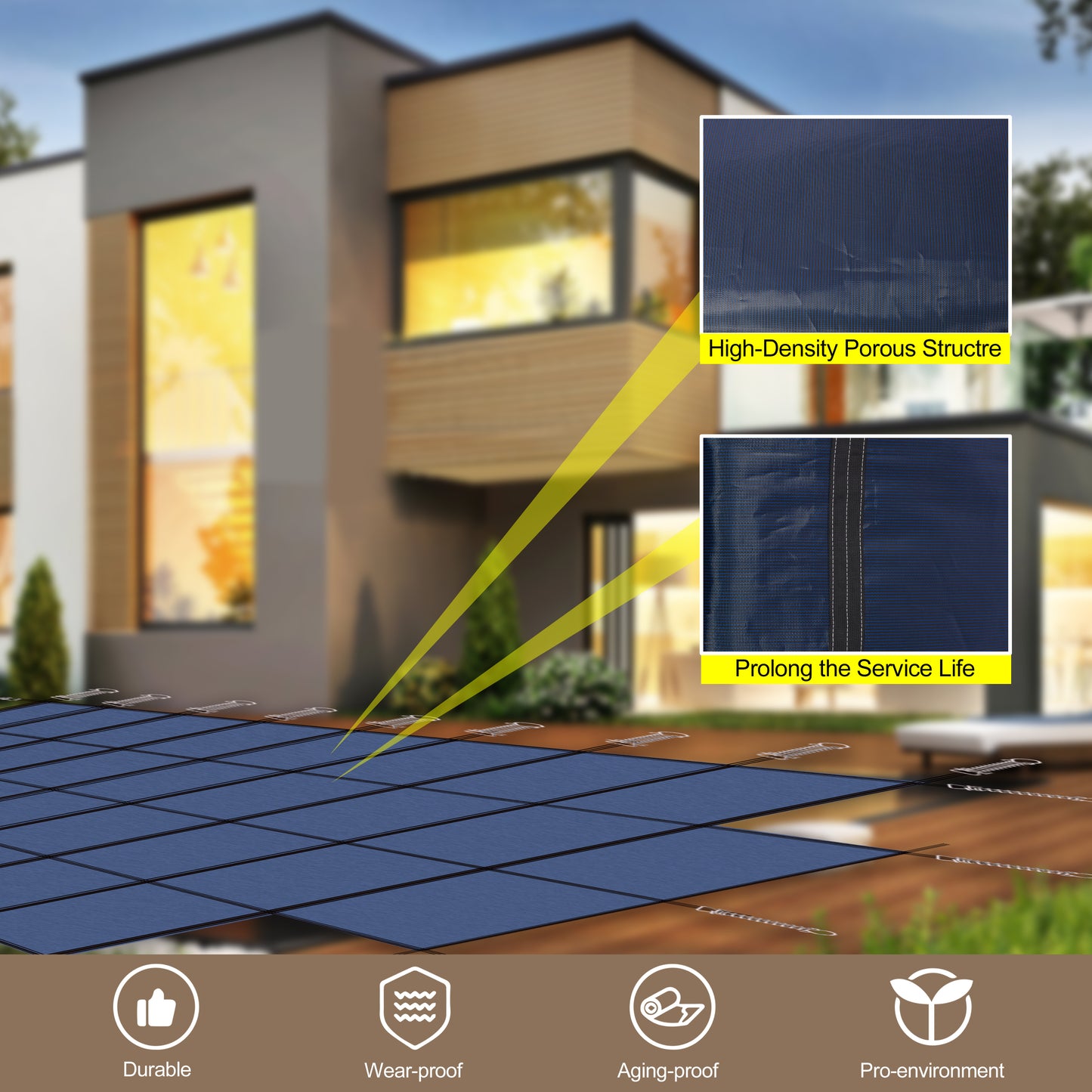 - Durable Premium Material: Crafted from high-strength polypropylene, our pool cover is built to last. Resistant to aging, heat, and abrasion, it’s reinforced with double straps and triple stitching for added durability. This long-lasting investment ensures your pool remains safe and secure during the winter months.