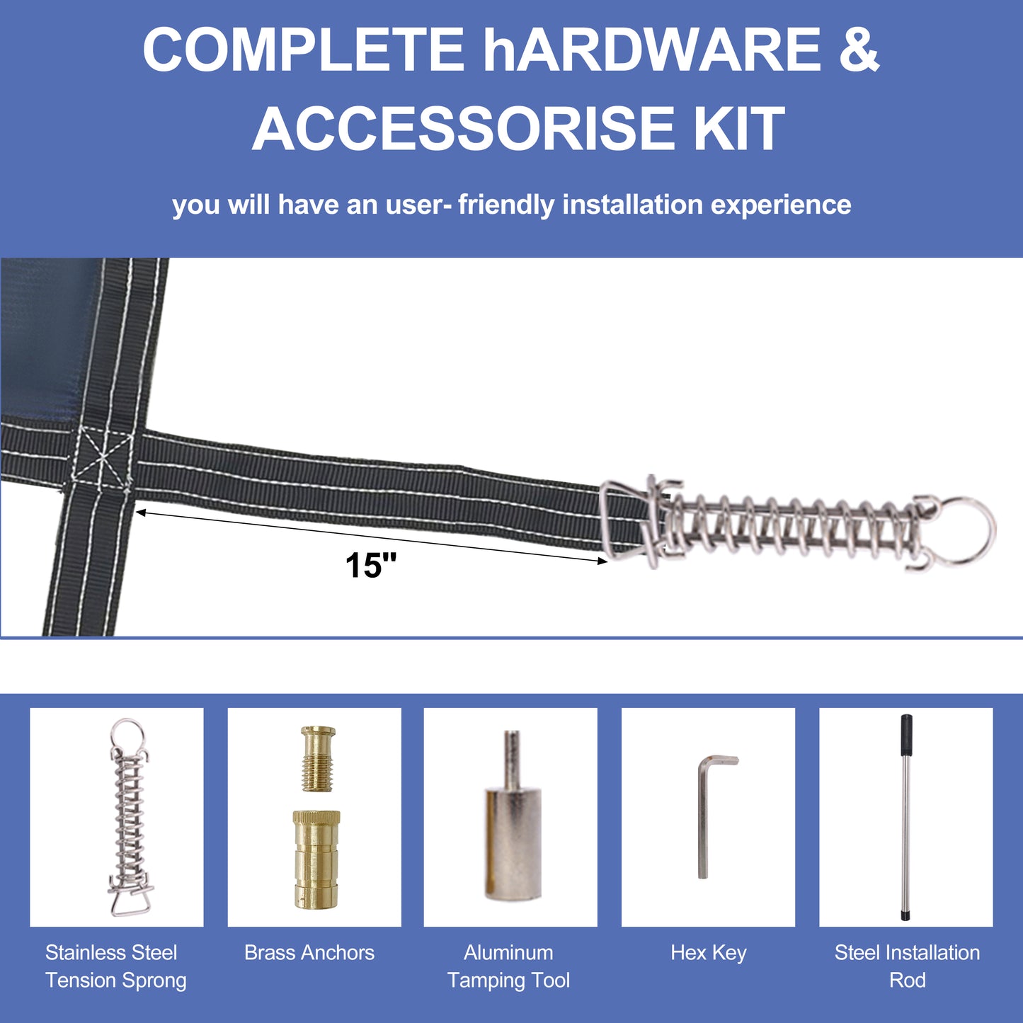 - Complete Hardware Kit for Easy Installation: The pool cover comes with all the necessary hardware for a simple and quick installation. The package includes brass anchors, stainless steel springs, and all required installation tools. With a drill and tamp brass anchoring system designed for concrete and an adjustable rope length, setup is straightforward and adaptable to different pool configurations.