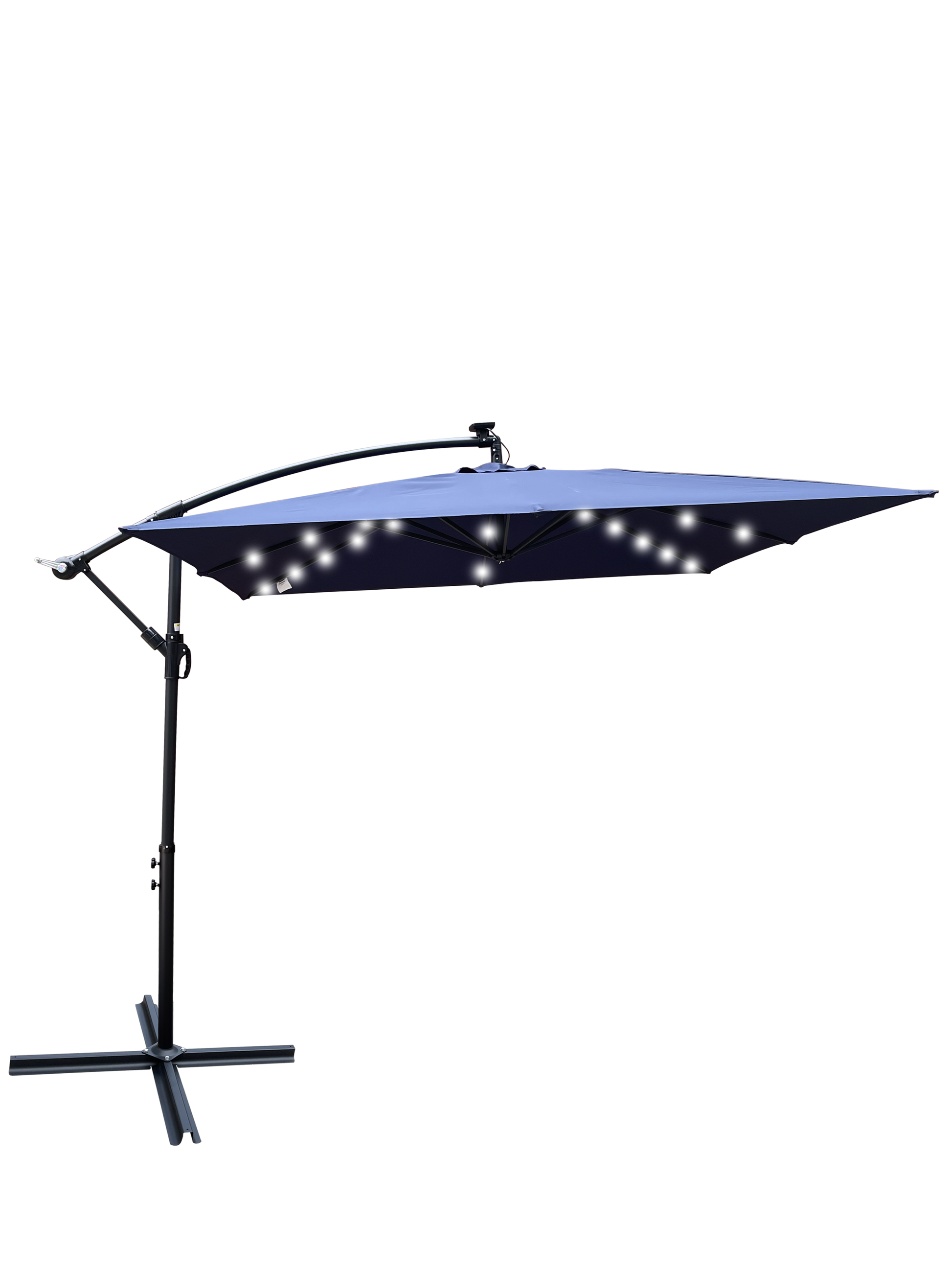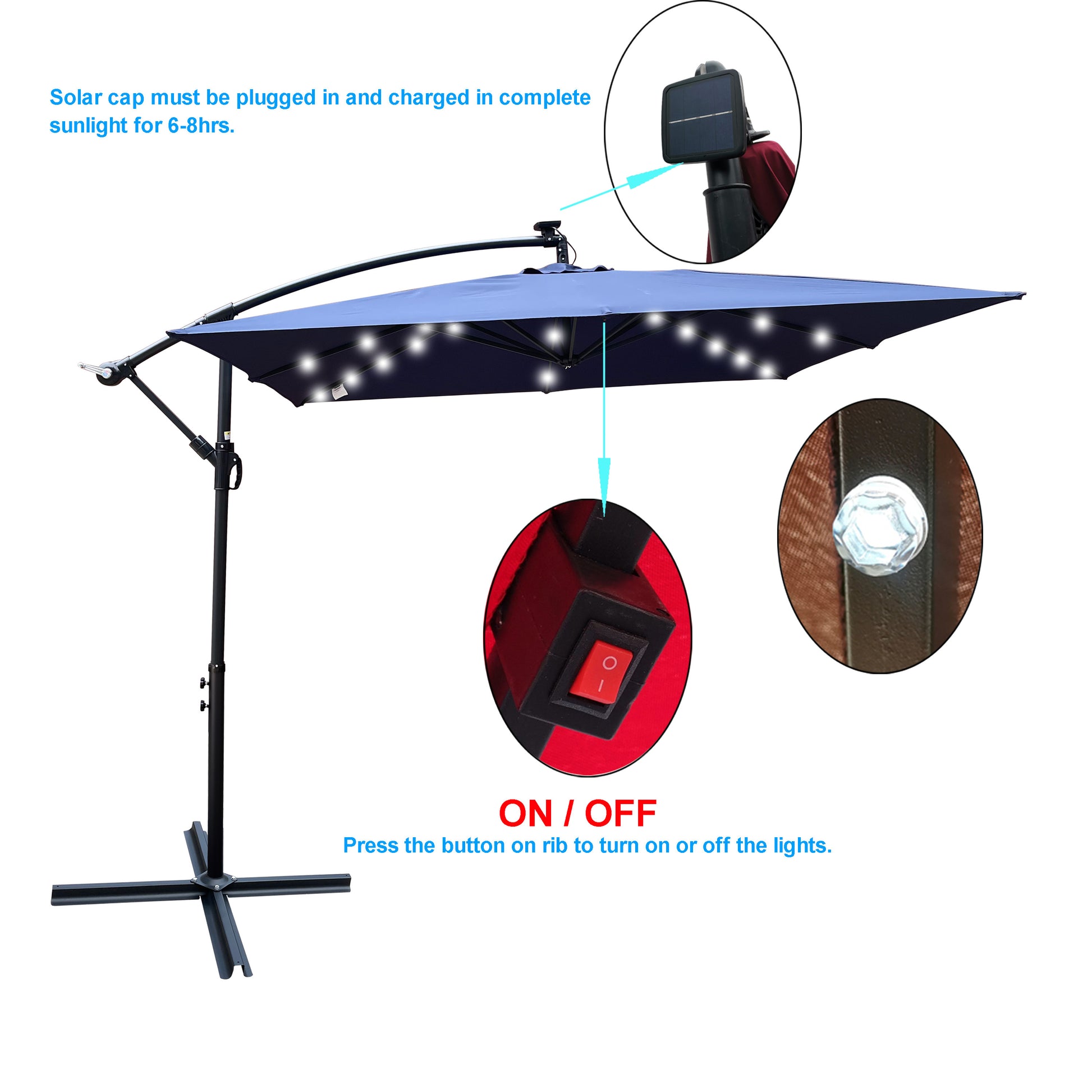 - The patio umbrella has 32 solar-powered LED lights( 4 long ribs with 20,4 short ribs with 12) that will light up your terrace when night falls. Soft lighting creates a romantic atmosphere for you. All LED bulbs are powered by solar panels at the top to save energy while maintaining perfect lighting.