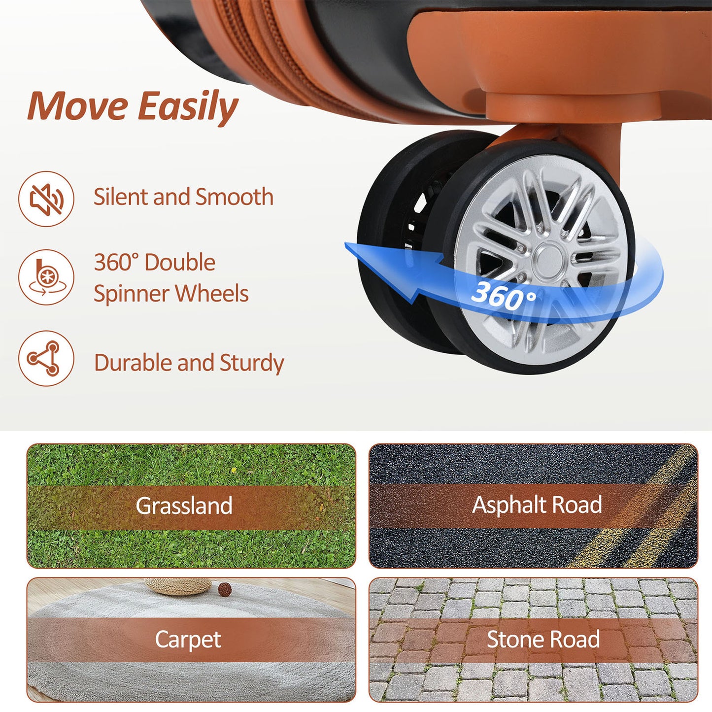 - 3-level telescopic handle with humanized anti-pinch design. 360° silent dual wheels are made of high-elastic TPE material. Adjust the height you need and move effortlessly. Bring convenience to travel.