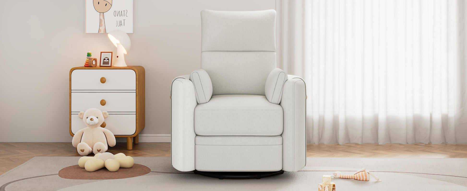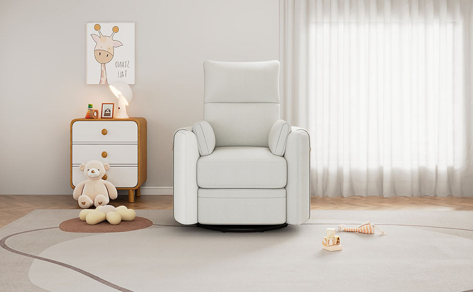 - Rocking &360 Degree Swiveling Nursery Recliner - This nursery glider recliner provides gentle movements back and forth and 360 degree swiveling, allowing you to gently calm your baby, helping relax them to sleep.
