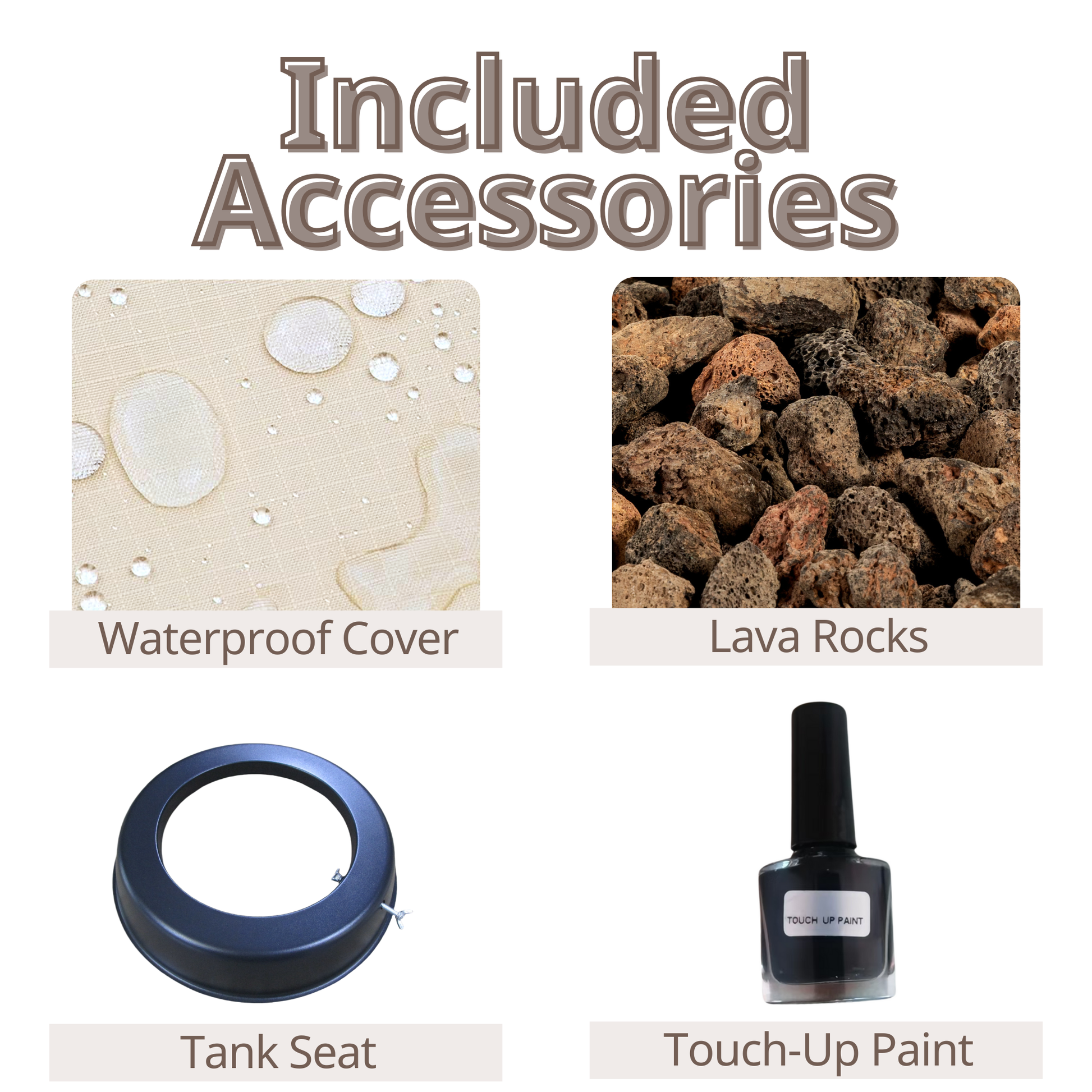 - 【Included Accessories & Customer Support】This outdoor fire table comes with 10 lbs of decorative lava rocks and a waterproof cover to protect it from harsh weather conditions like rain, wind, and snow, extending its lifespan. Additionally, it includes a bottle of touch-up paint in the same color for minor maintenance, along with a product instruction manual for proper use and care. Our dedicated customer support team is always ready to assist you with any questions or concerns.