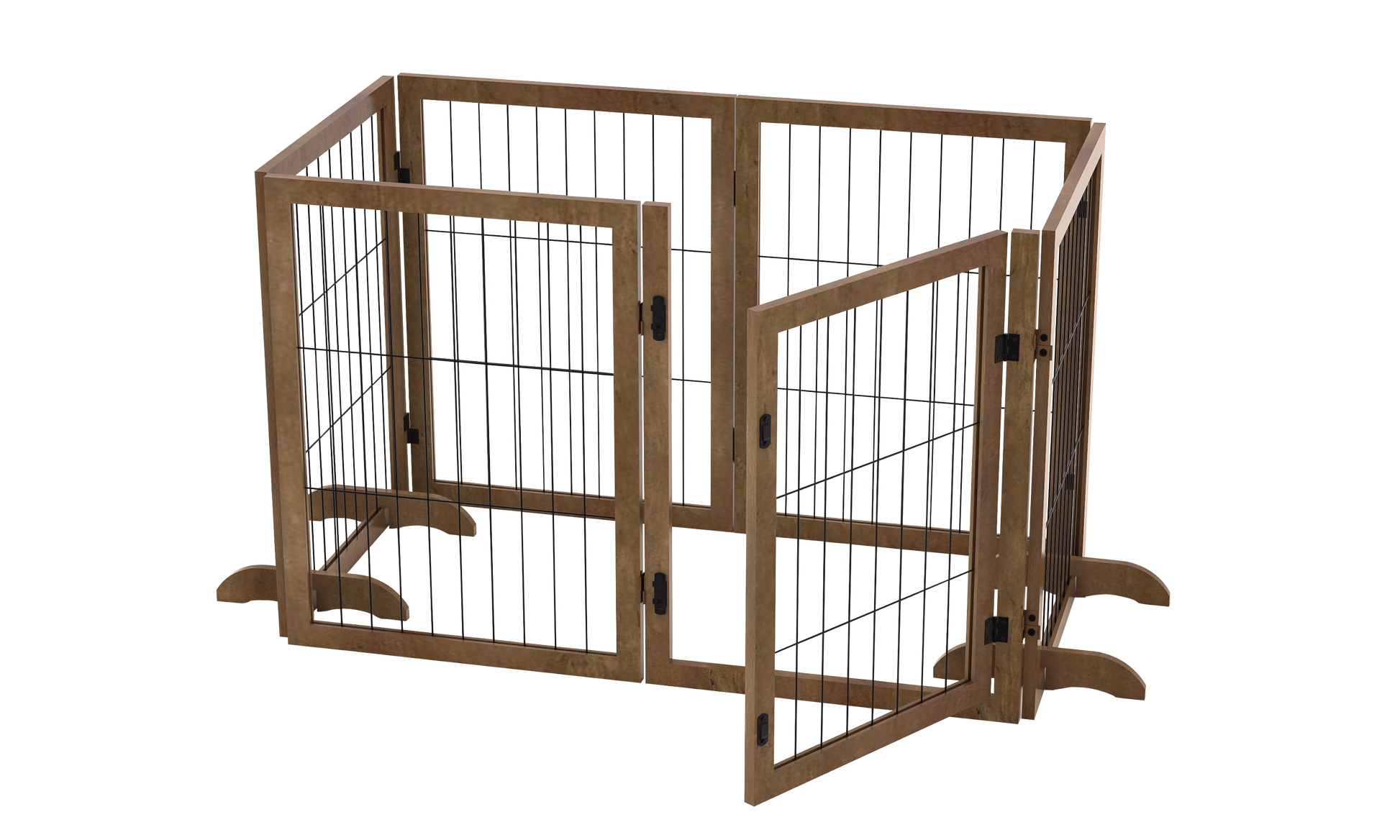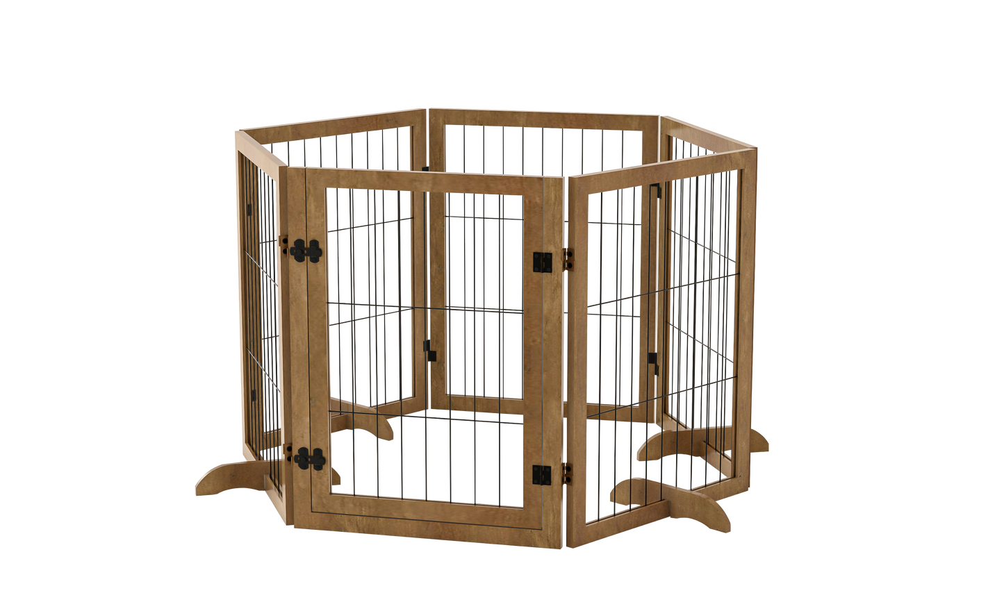 - Multiple Shape Dog Gate: This Wooden Dog Gate consists of 6 pet panels, connected with 360 degree hinges for changing shape, straight, rectangle, hexagon for living room, kitchen, doorways, stairs,balcony, porch, pool side.