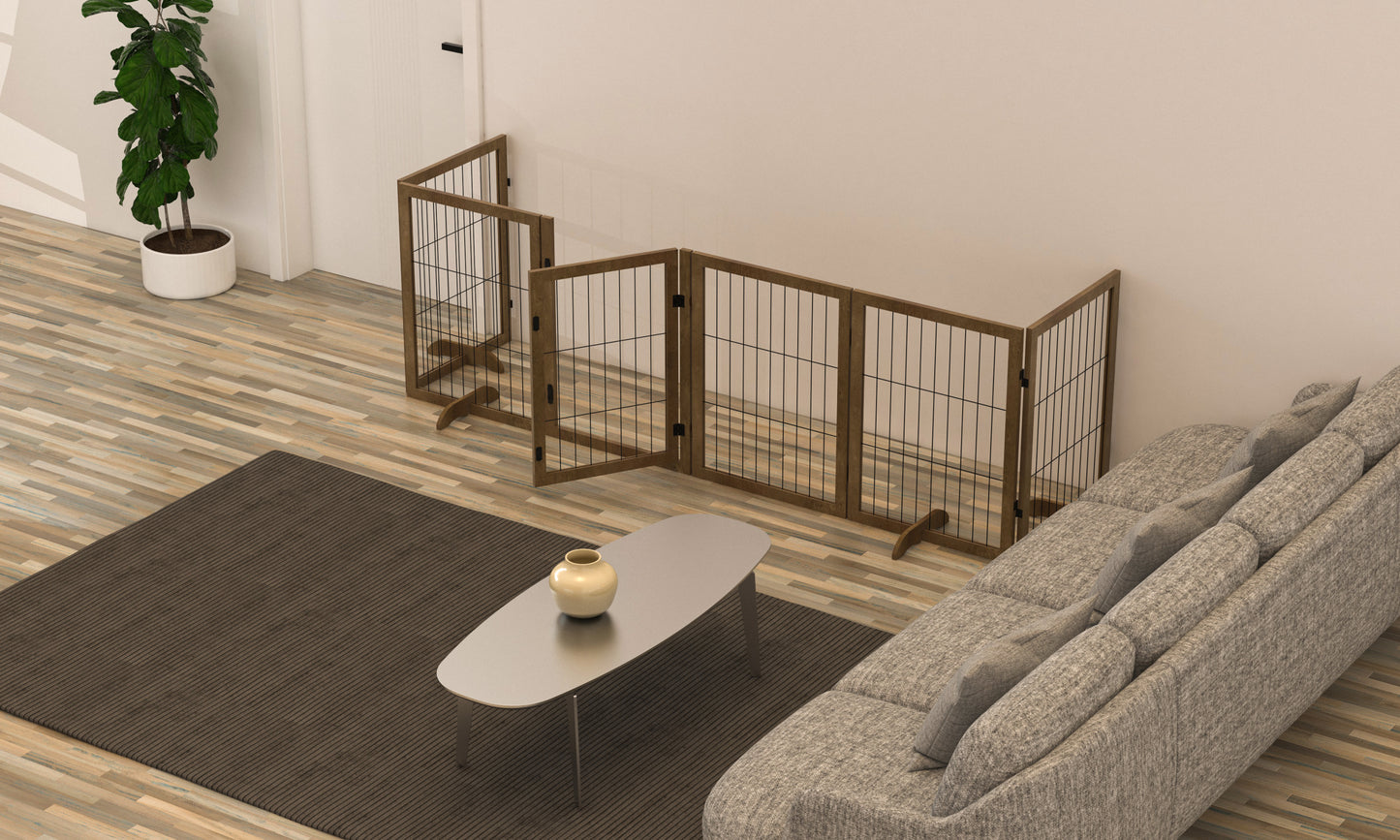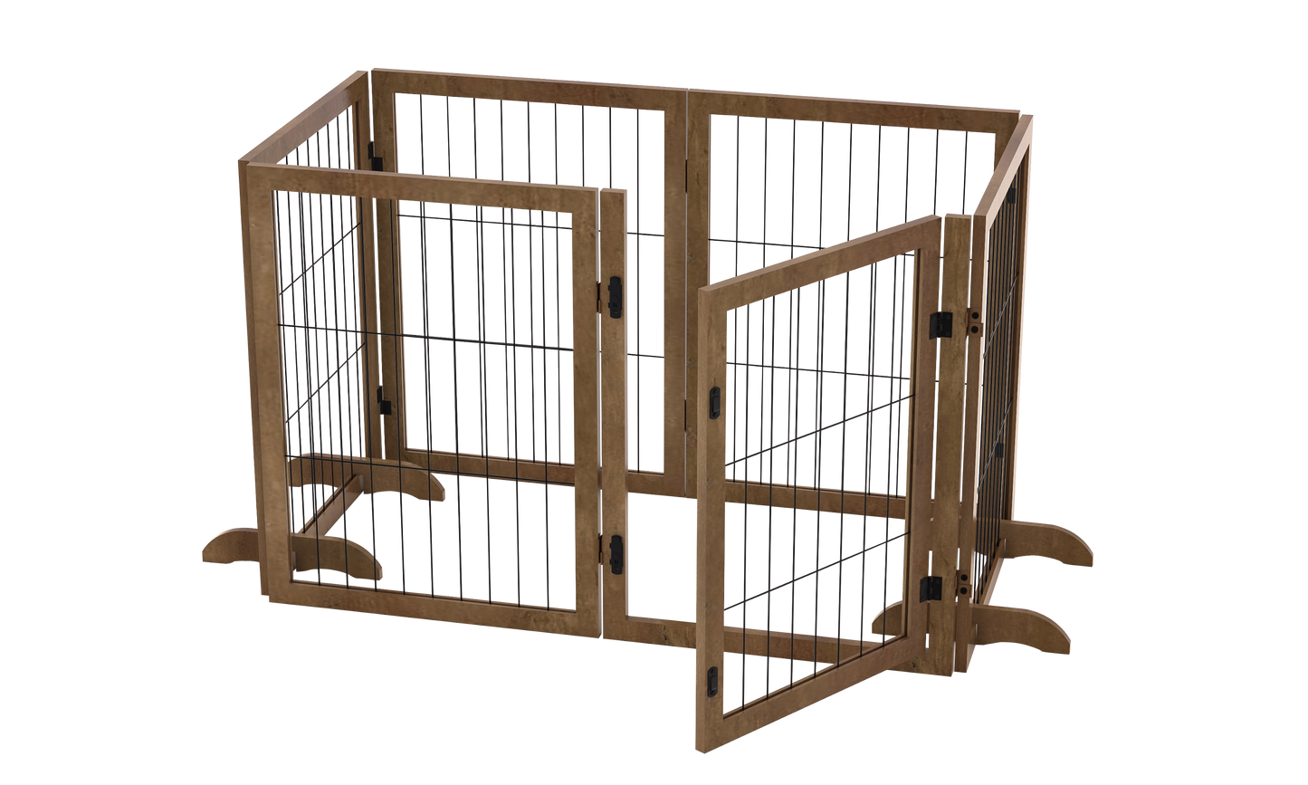 - Durable Dog Barrier: Constructed of sturdy wood frame and strong metal wire. 4pcs support feet for extra balance, stability and security, not easy to tip over. And the wood dog gate fits great in any home decor