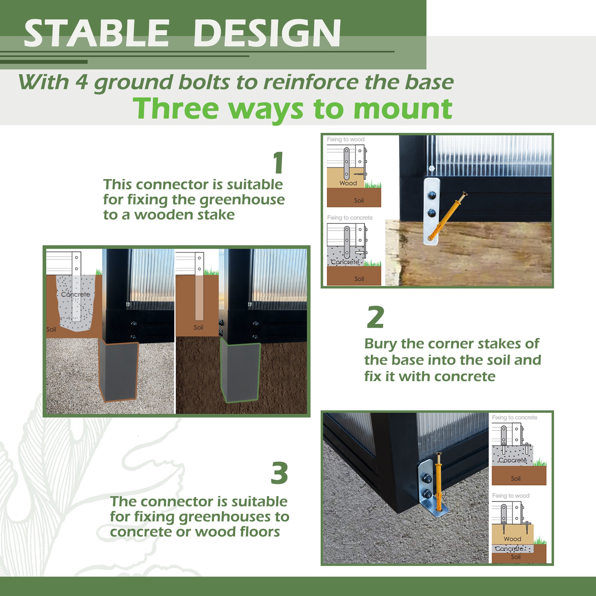 - 【Secure & Stable, Practical Features】 Our greenhouse is equipped with a lockable door for security. It features 2 temperature-regulating windows, along with 4 drainage ports that support the extension of 1-inch water pipes for easy management. Constructed with high-quality aluminum alloy, it is rust-resistant and durable. We provide three fixing methods for cement ground, soil, and wooden stakes, ensuring stability and resistance to severe weather, including tornadoes.
