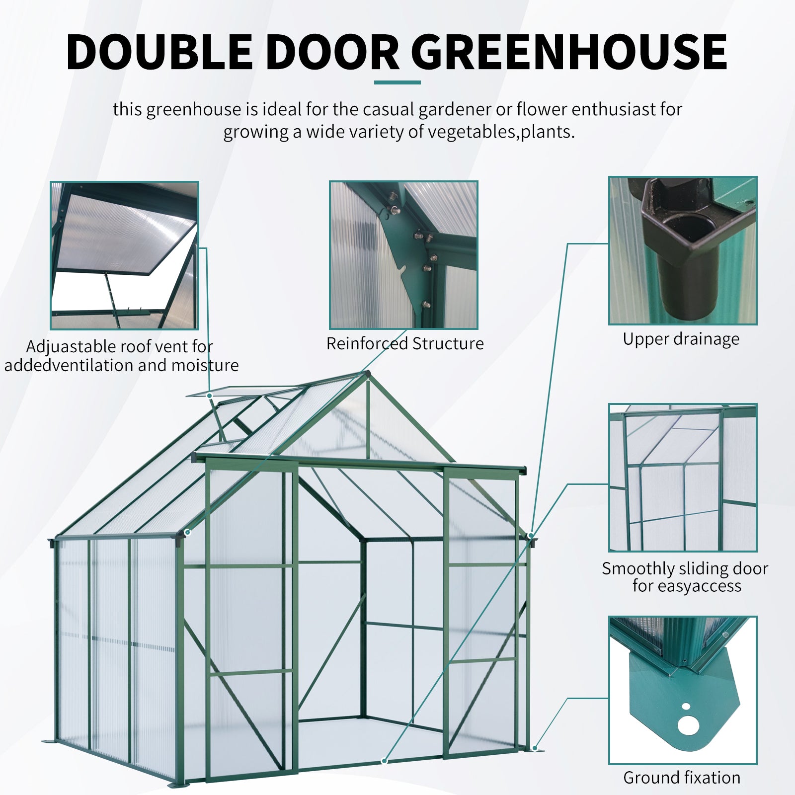 8X6FT-Green Double Door Polycarbonate Greenhouse Raised Base and Anchor Aluminum Heavy Duty Walk-in Greenhouses for Outdoor Backyard in All Season
