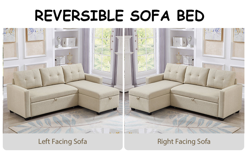 [SantaChoice] Upholstered Pull Out Sectional Sofa with Storage Chaise, Convertible Corner Couch, Beige