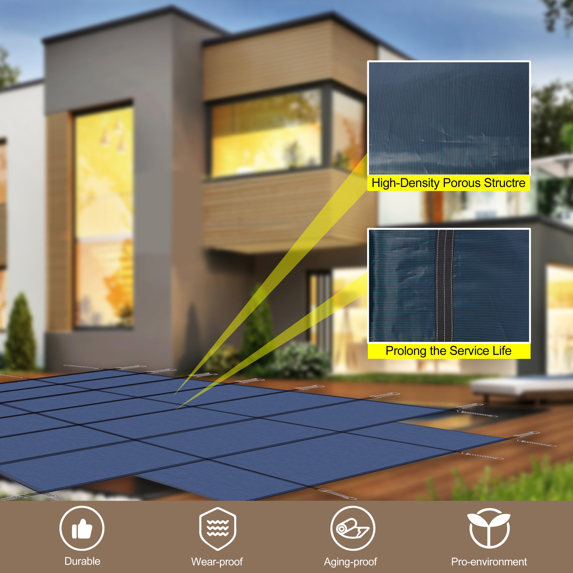 - Tight Mesh Design for Superior Protection: Featuring a tight mesh construction, our pool cover effectively drains water while keeping out leaves, snow, and other debris. The cover blocks sunlight, preventing algae growth and ensuring a clean, clear pool when the warmer months return.