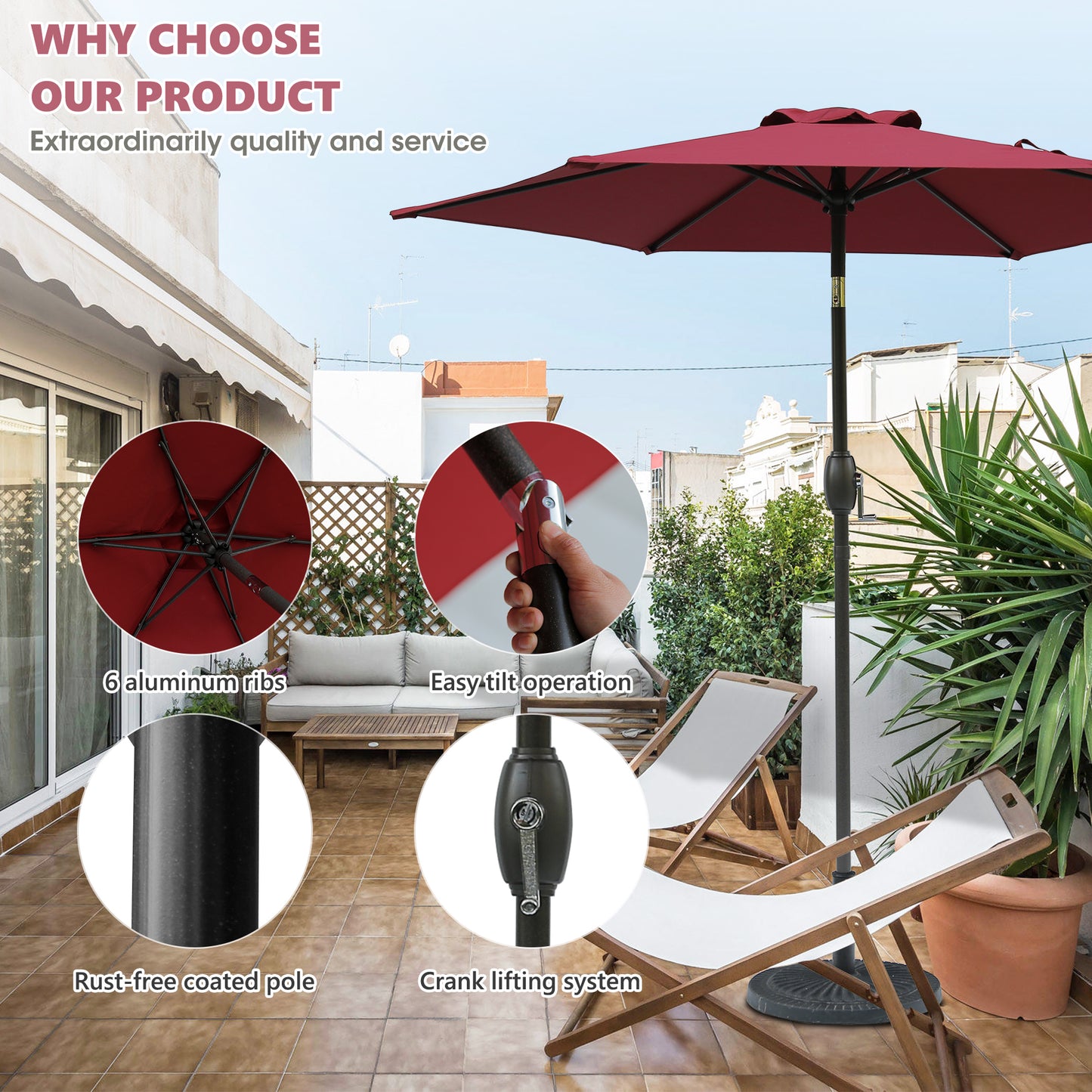 - Adjustable Shade: The outdoor umbrella features a crank system for effortless opening and closing. With its user-friendly push button tilt, you can easily adjust the umbrella for perfect shade.