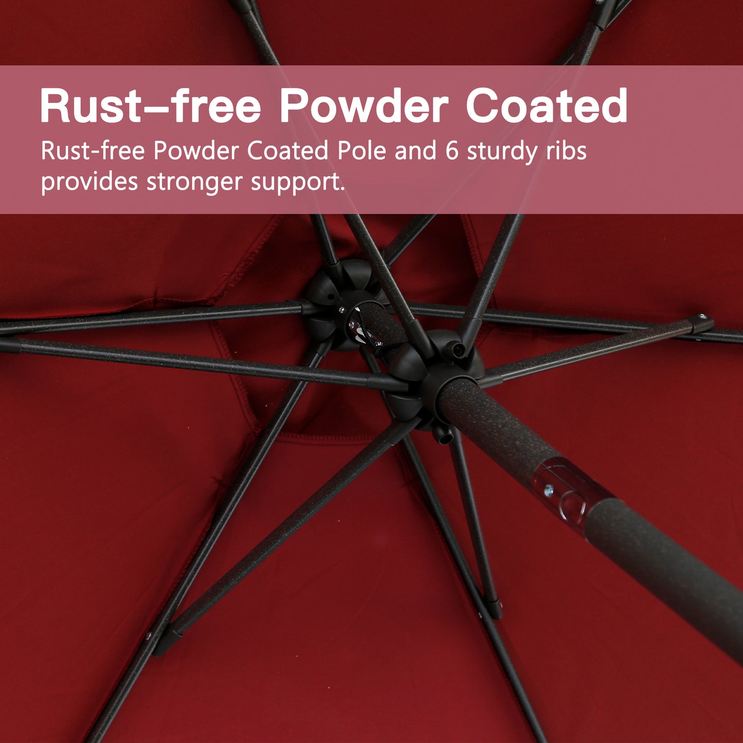 - Sturdy Construction: The market umbrella is made with a powder-coated heavy-duty steel pole and 6 ribs, ensuring rust resistance and long-lasting durability under sunny days and rainy nights.