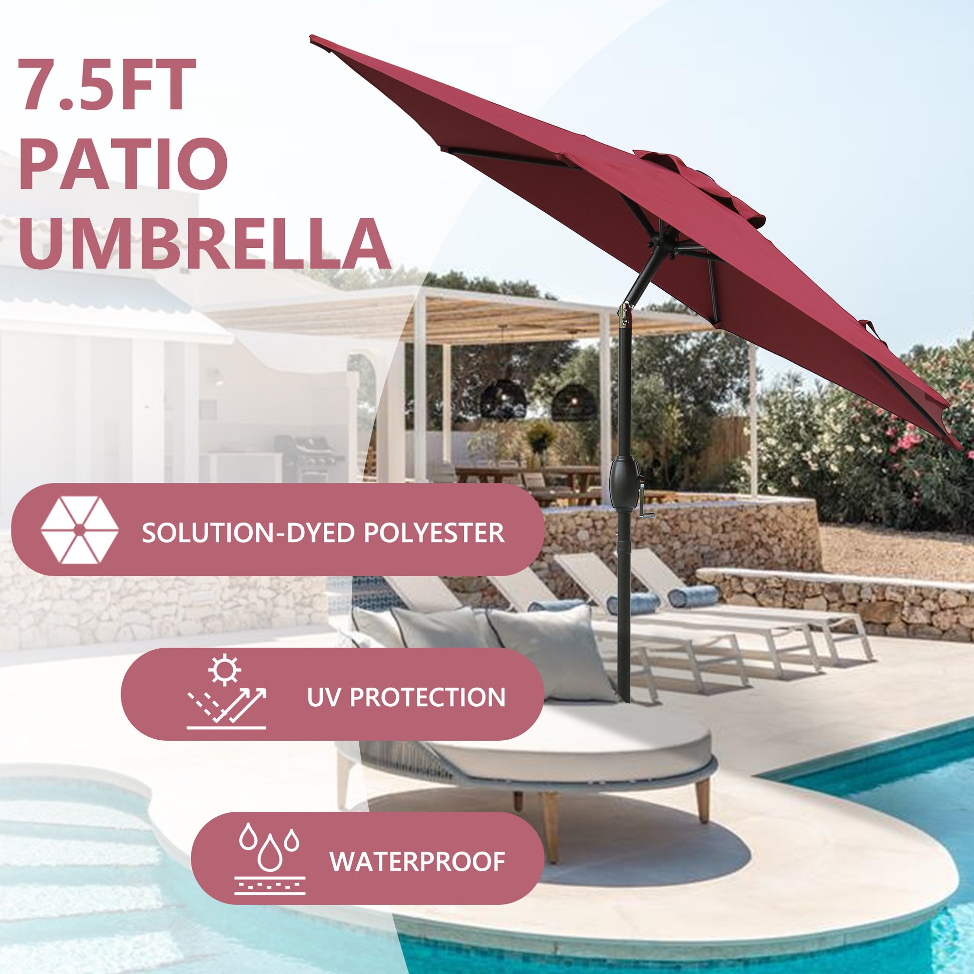 7.5ft * 7.5ft Patio Umbrella with Crank and Push Button Tilt, Outdoor Table Market Umbrella with Aluminum Pole - Red