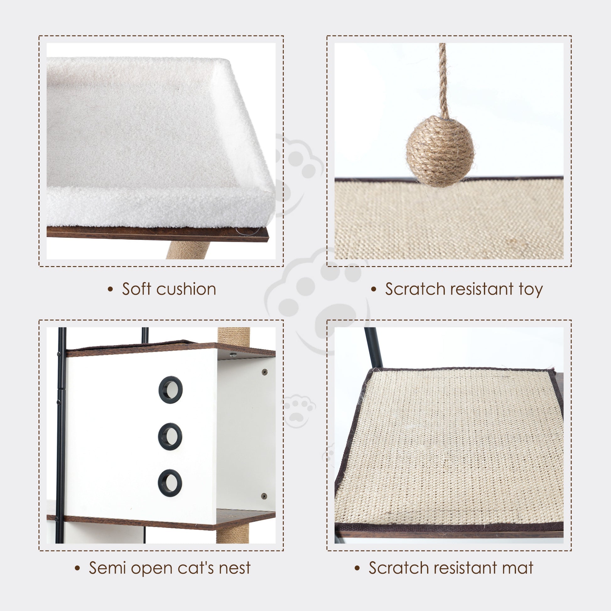 - 4.Thoughtful Details: Platforms for sogespet cat tower condo are equipped with cat scratching pads which can effectively prevent cats from slipping and falling. At the top is a soft line bed to give your cat a comfortable sleep without disturbances.