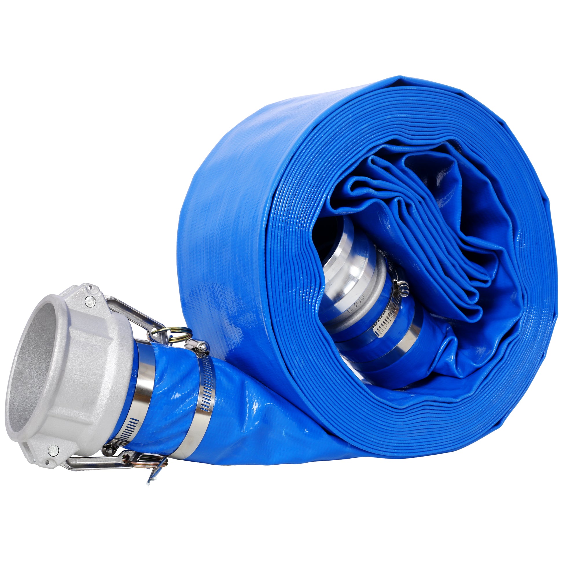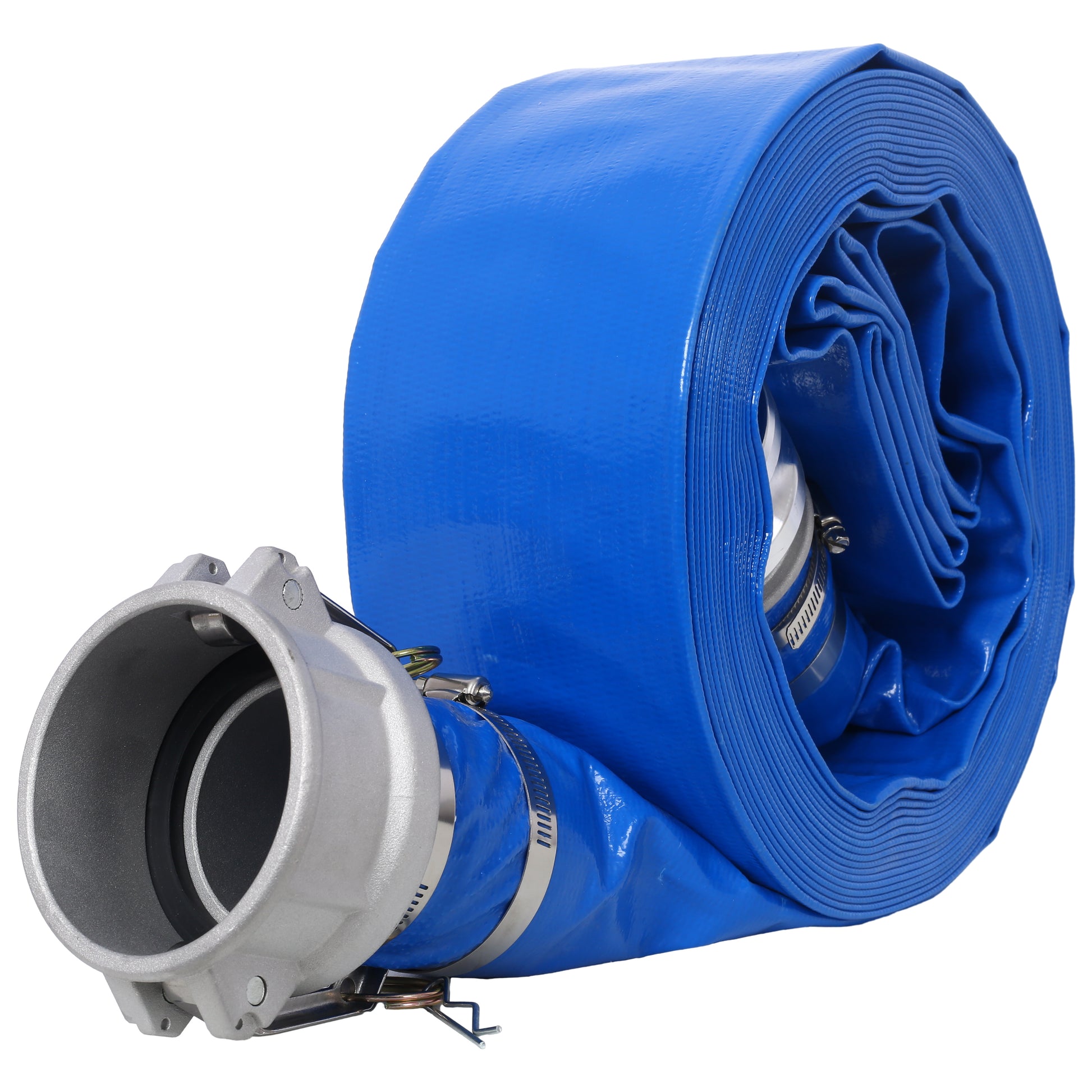 - This discharge hose is made from durable PVC material and reinforced with polyester yarn, designed for heavy-duty use. It comes equipped with male and female aluminum camlock couplings (Type E and Type C), making it ideal for transferring and discharging water in a variety of applications including household swimming pools, agricultural irrigation, industrial, construction, and marine environments.