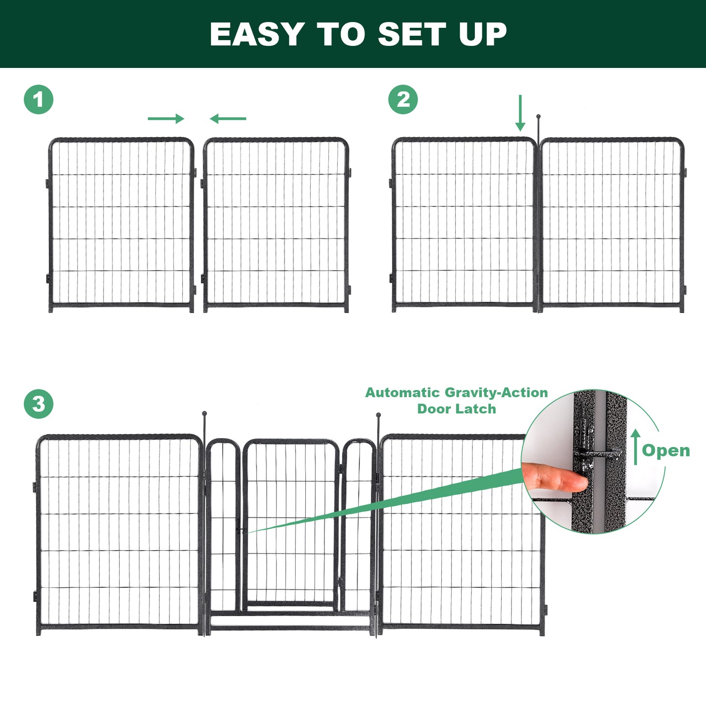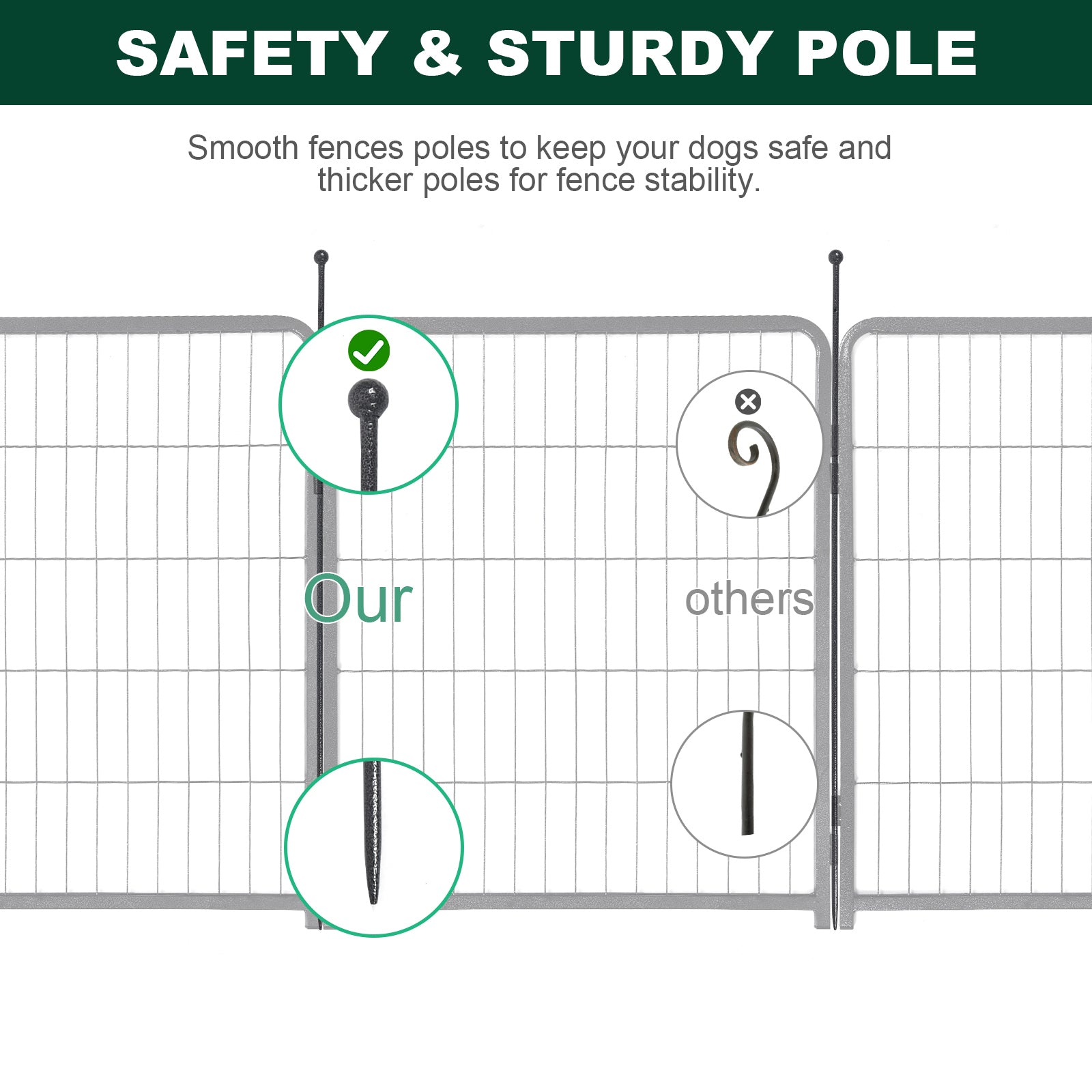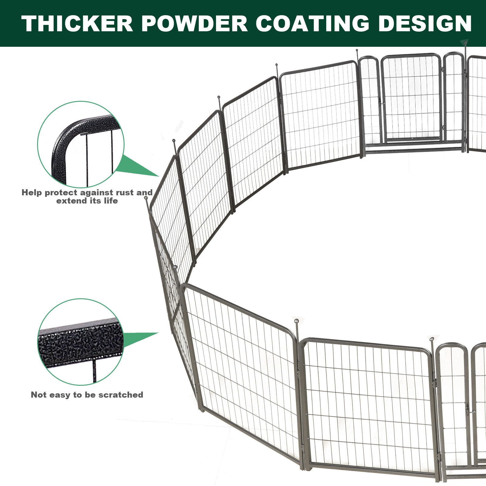 - Pet Fence's surface has two layers of hammer pattern coating. The coating has a smooth silver-black surface, and is not easy to peel and rust. It can be placed in all kinds of weather