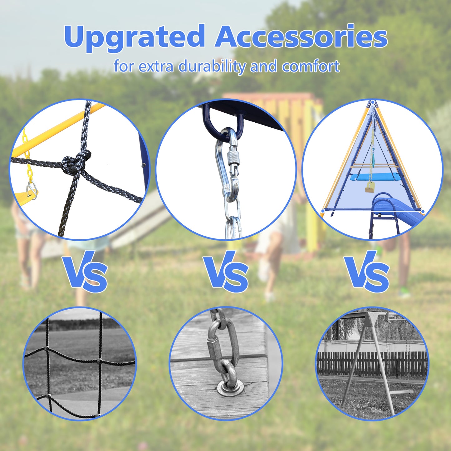 500 lbs 7 in 1 Swing Set for Kids Backyard Outdoor A-Frame Heavy-Duty Metal Swing Sets with Slide, 2 Swing Seats, 1 Climbing Net & Ladder, 1 Gym Ring, 1 Basket