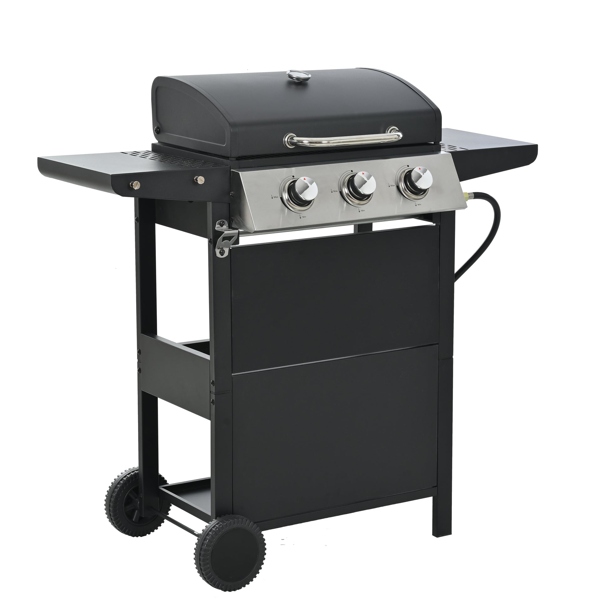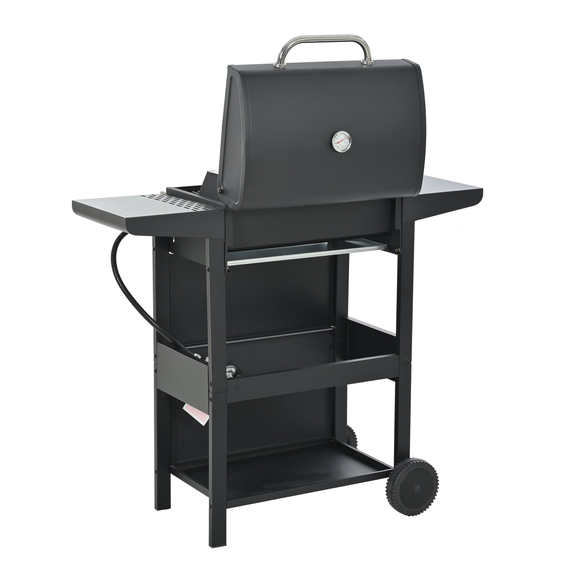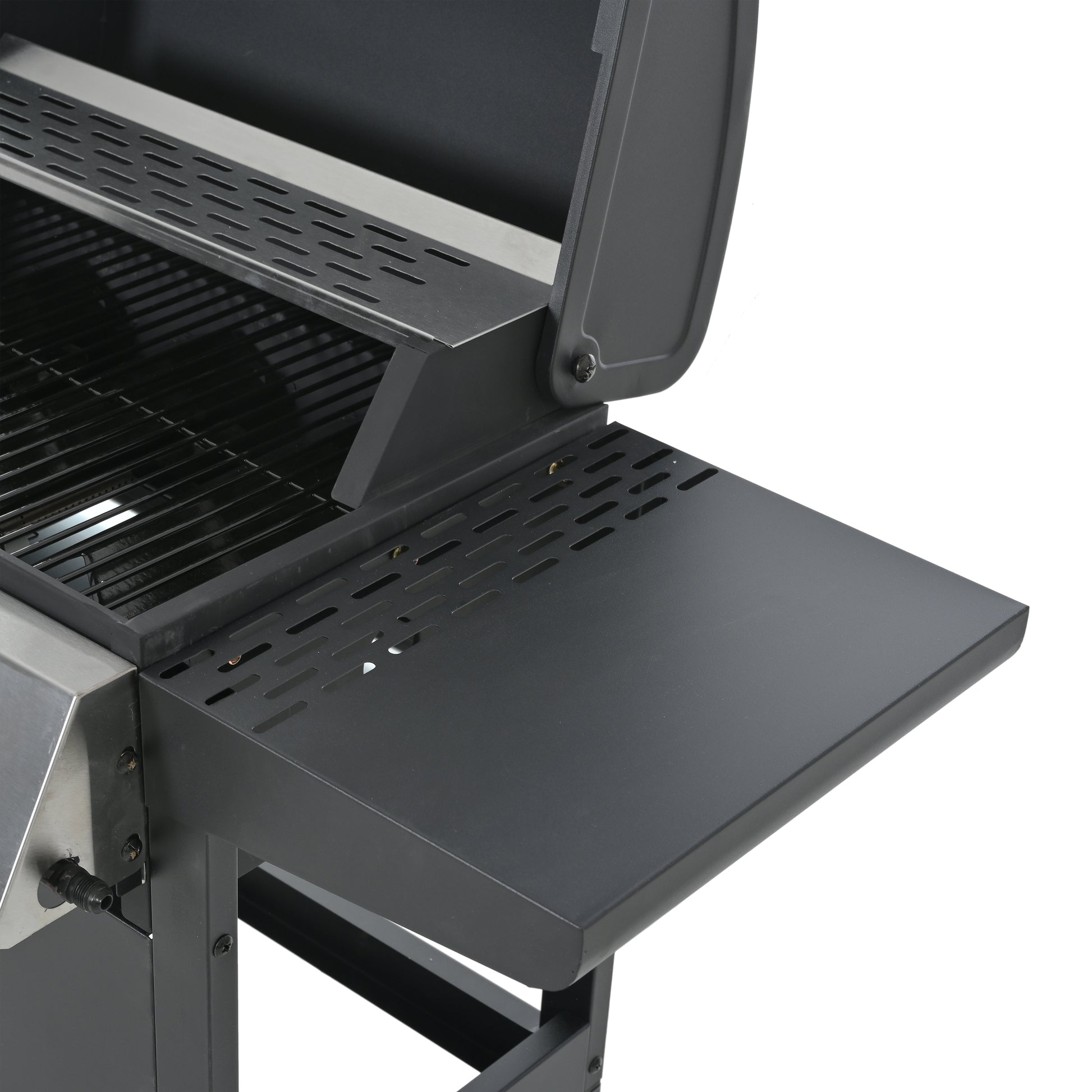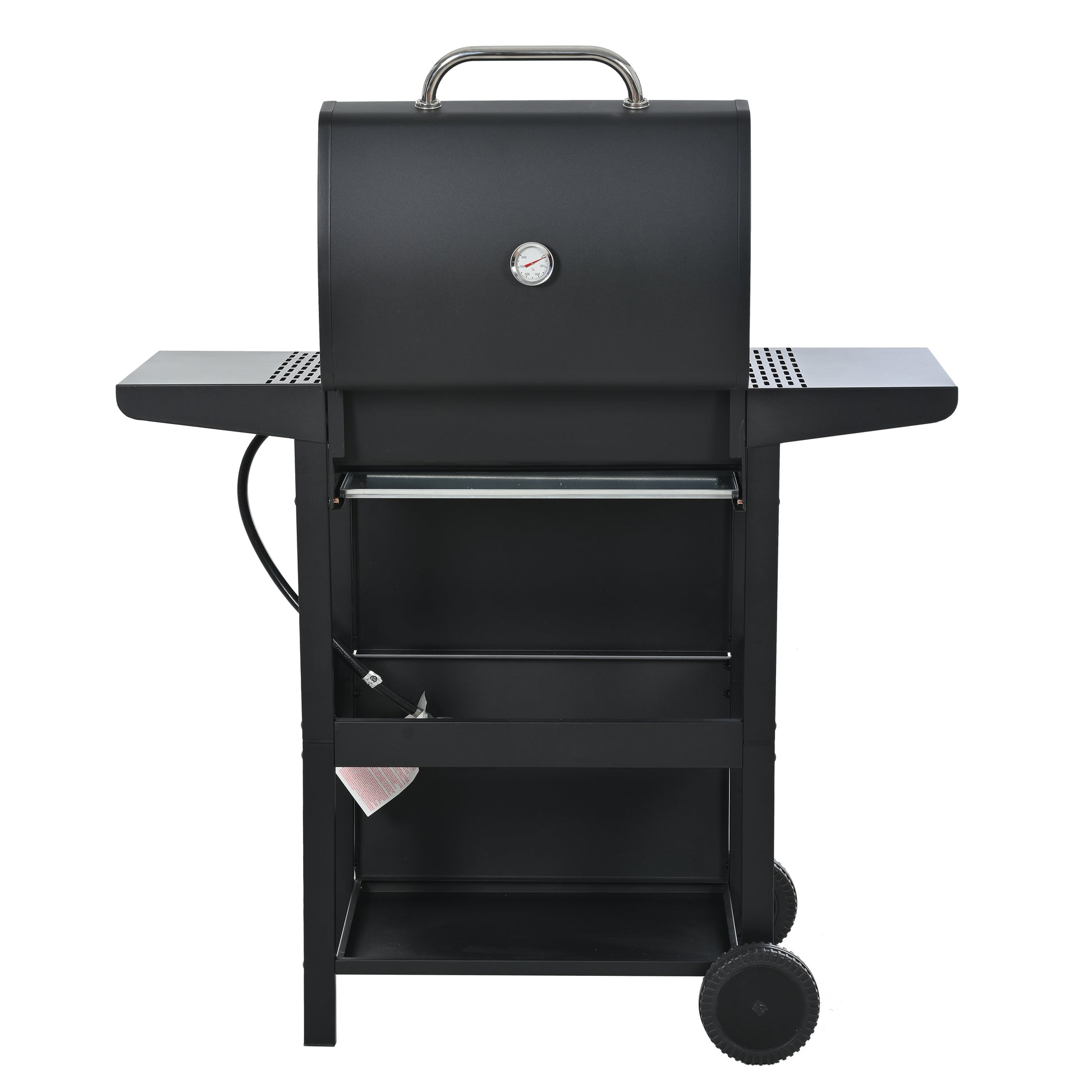 - CONVENIENCE: The whole Stainless steel control panel with chromium plating control knob makes this propane gas grill more study and delicate, a stainless steel handle and a built-in stainless steel thermometer on the cover lid, two tables and two wheel casters for storage and moving