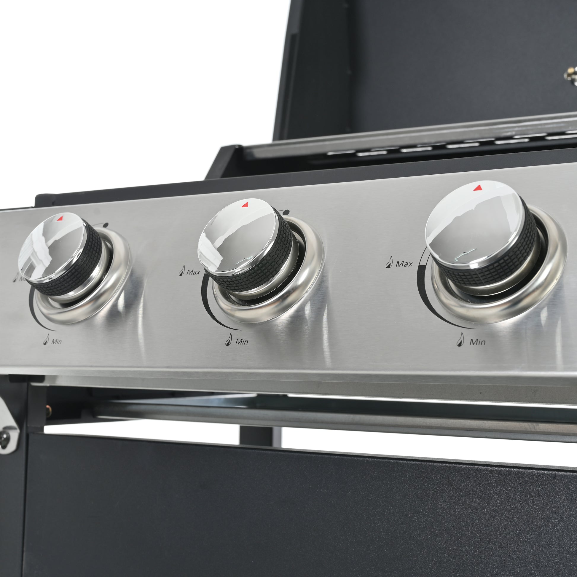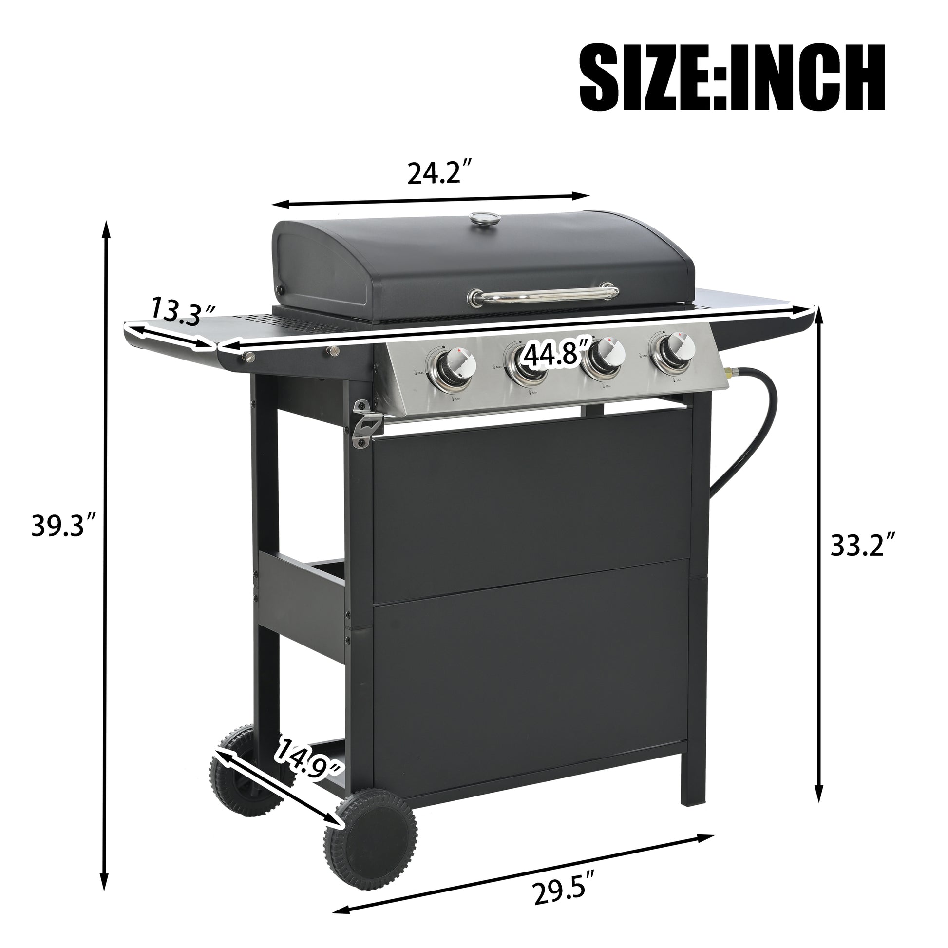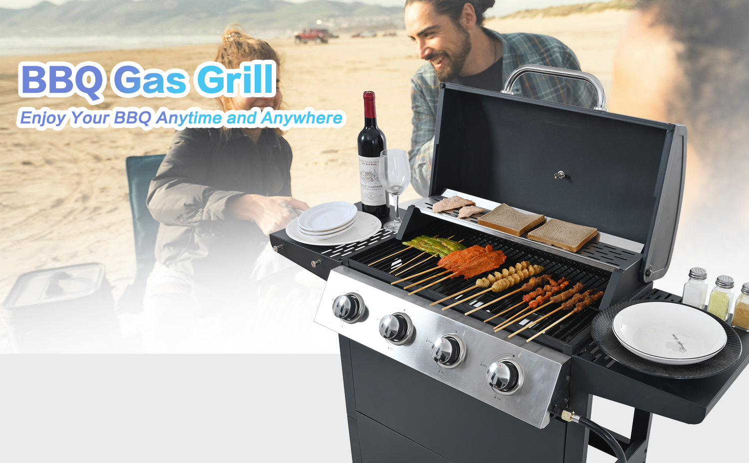 - STAINLESS STEEL BURNERS: This propane gas grill has 4 Stainless Steel burners, can put out 34,000 BTU-per-hour with integrated piezoelectric ignition system, quick start up with the push &turn of a control knob.