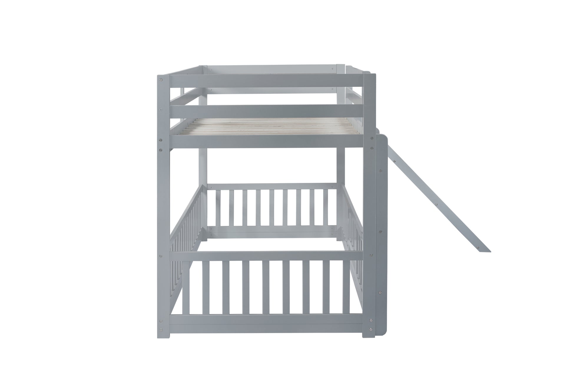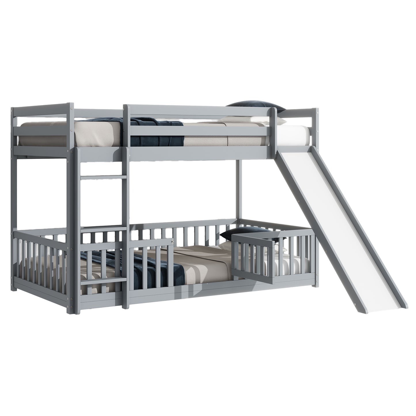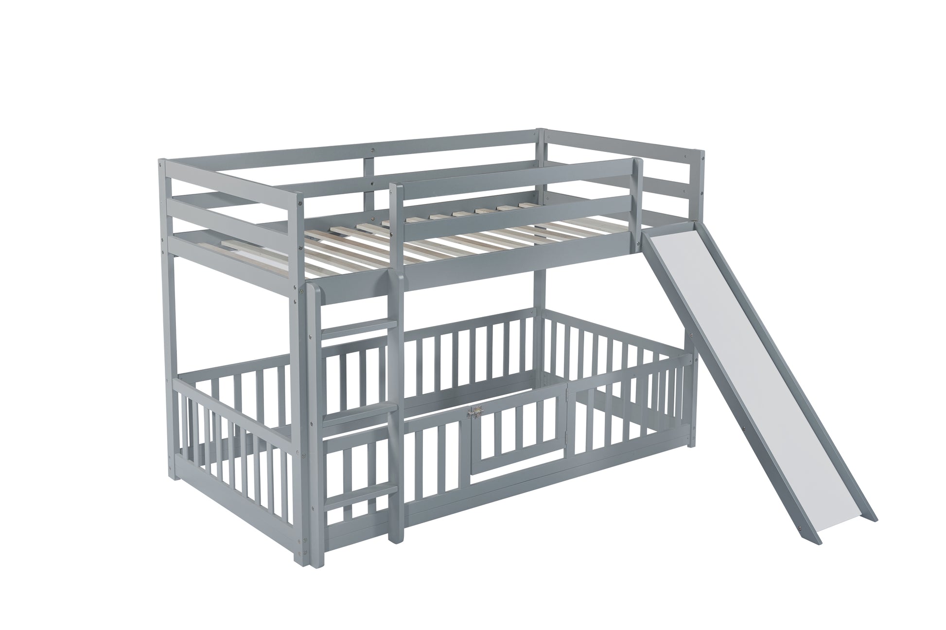 Twin Over Twin Floor Bunk Bed with Slide, Ladder, Door, Safety Guardrails, Solid Pine Wood Bunk Bed ,Grey