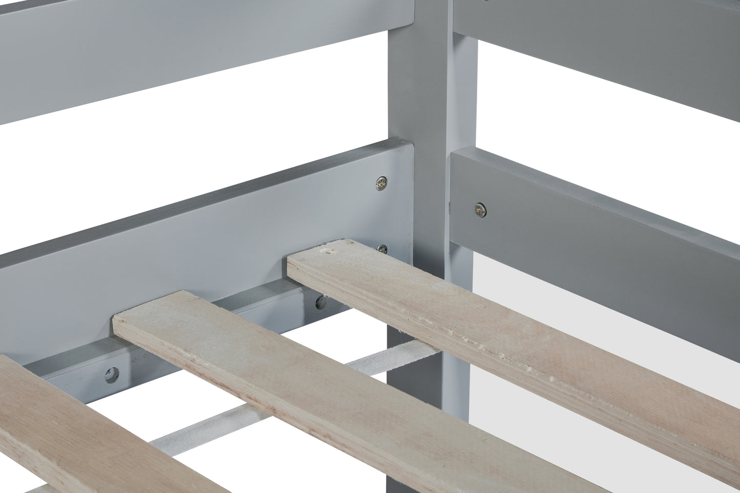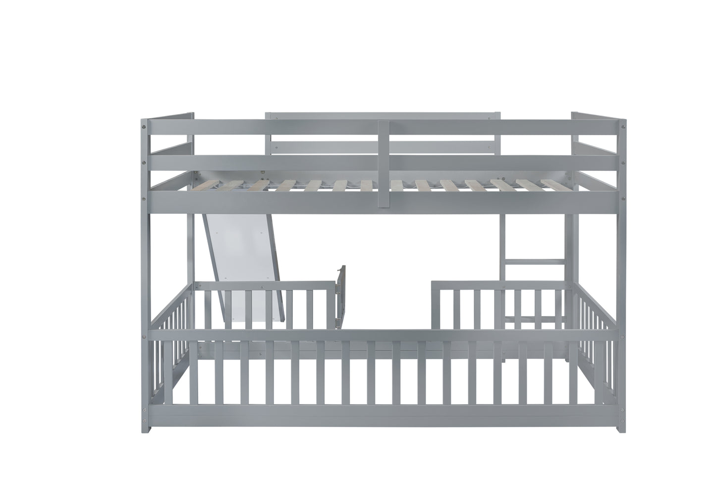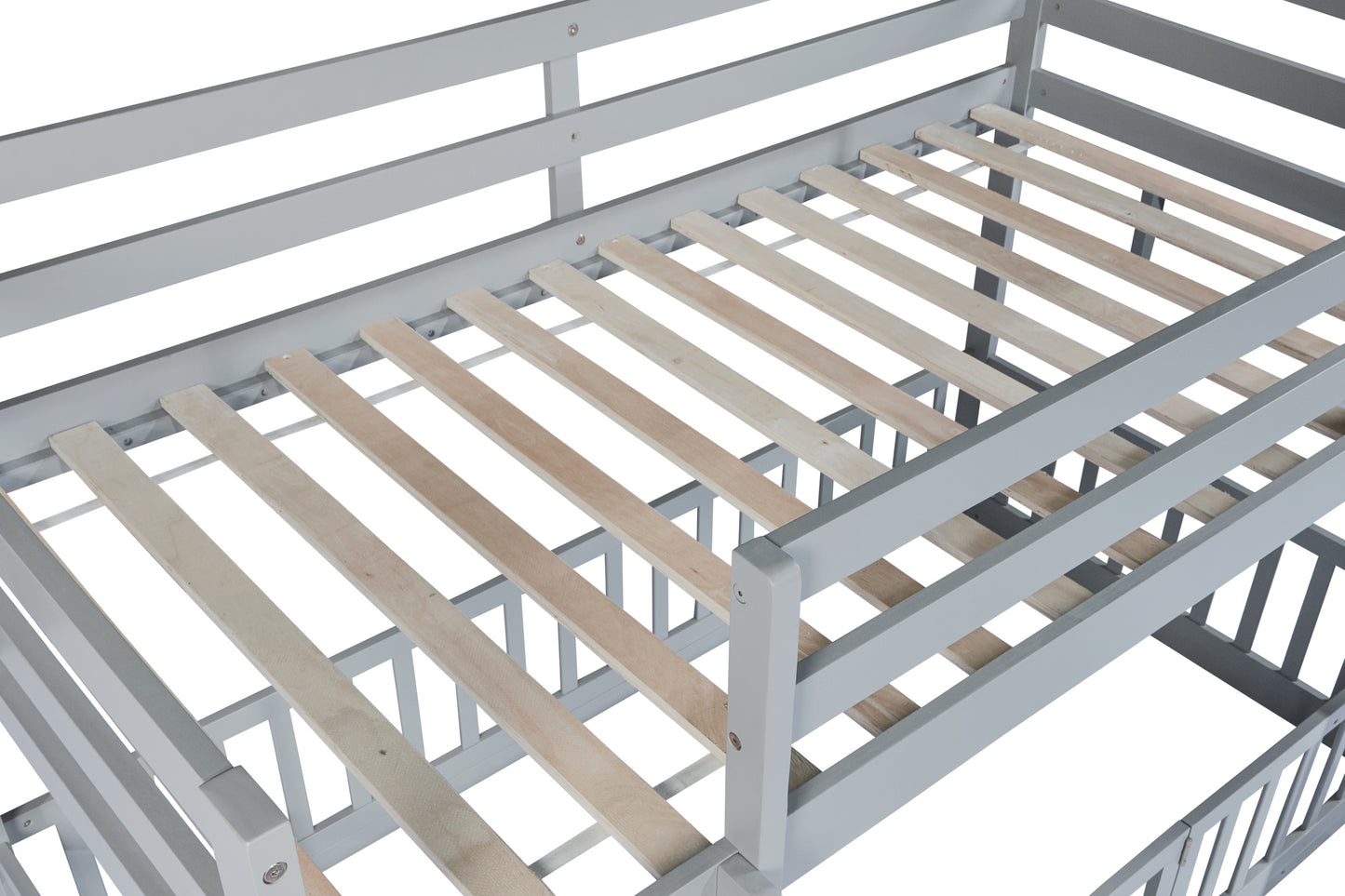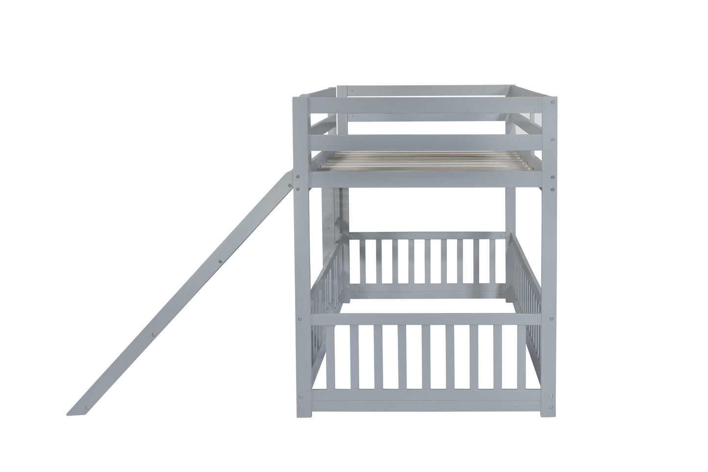 Twin Over Twin Floor Bunk Bed with Slide, Ladder, Door, Safety Guardrails, Solid Pine Wood Bunk Bed ,Grey