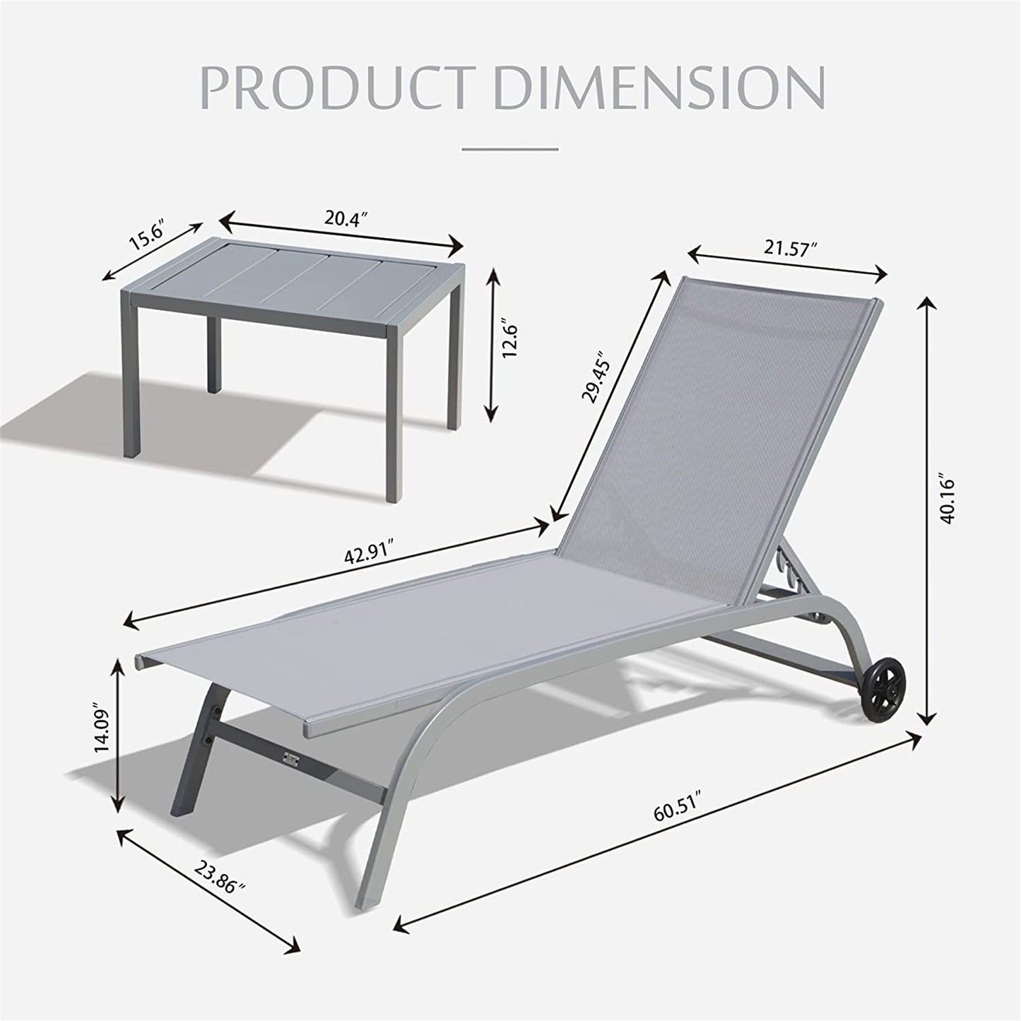 Chaise Lounge Outdoor Set of 3, Lounge Chairs for Outside with Wheels, Outdoor Lounge Chairs with 5 Adjustable Position, Pool Lounge Chairs for Patio, Beach(Grey,2 Lounge Chairs+1 Table)