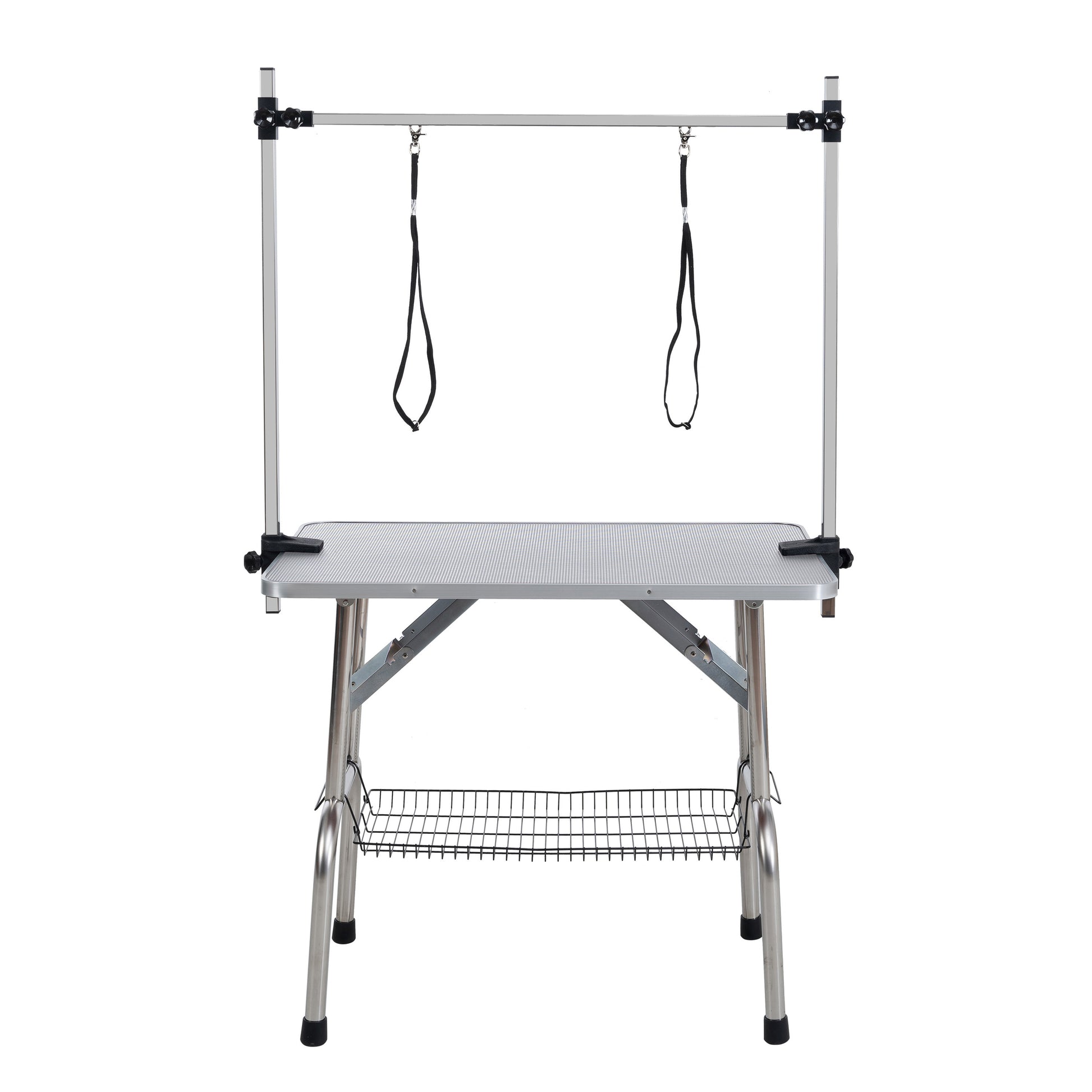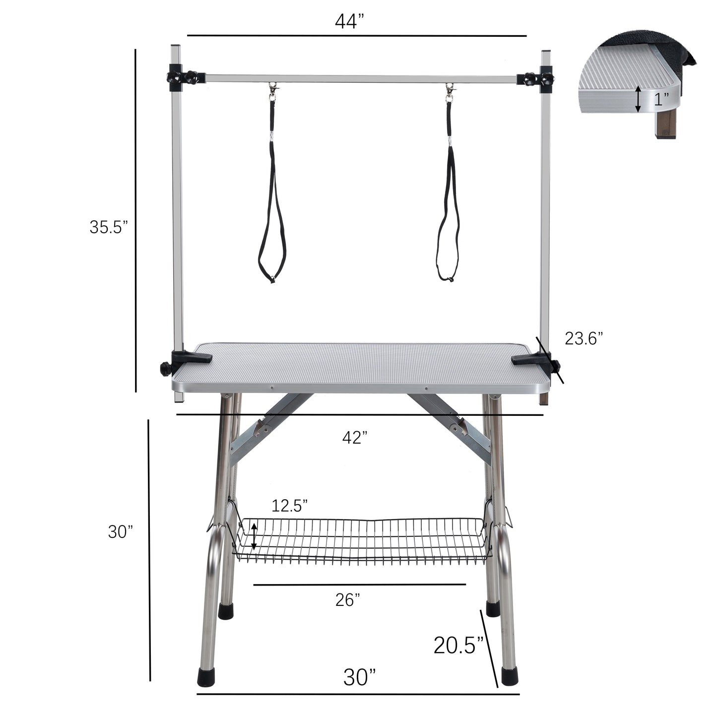 42" Folding Dog Pet Grooming Table Stainless Steel Frame Rubber Mat on Board with Adjustable Arm and Clamps pet dog Cat Grooming Table (SILVER-GRAY COLOR)