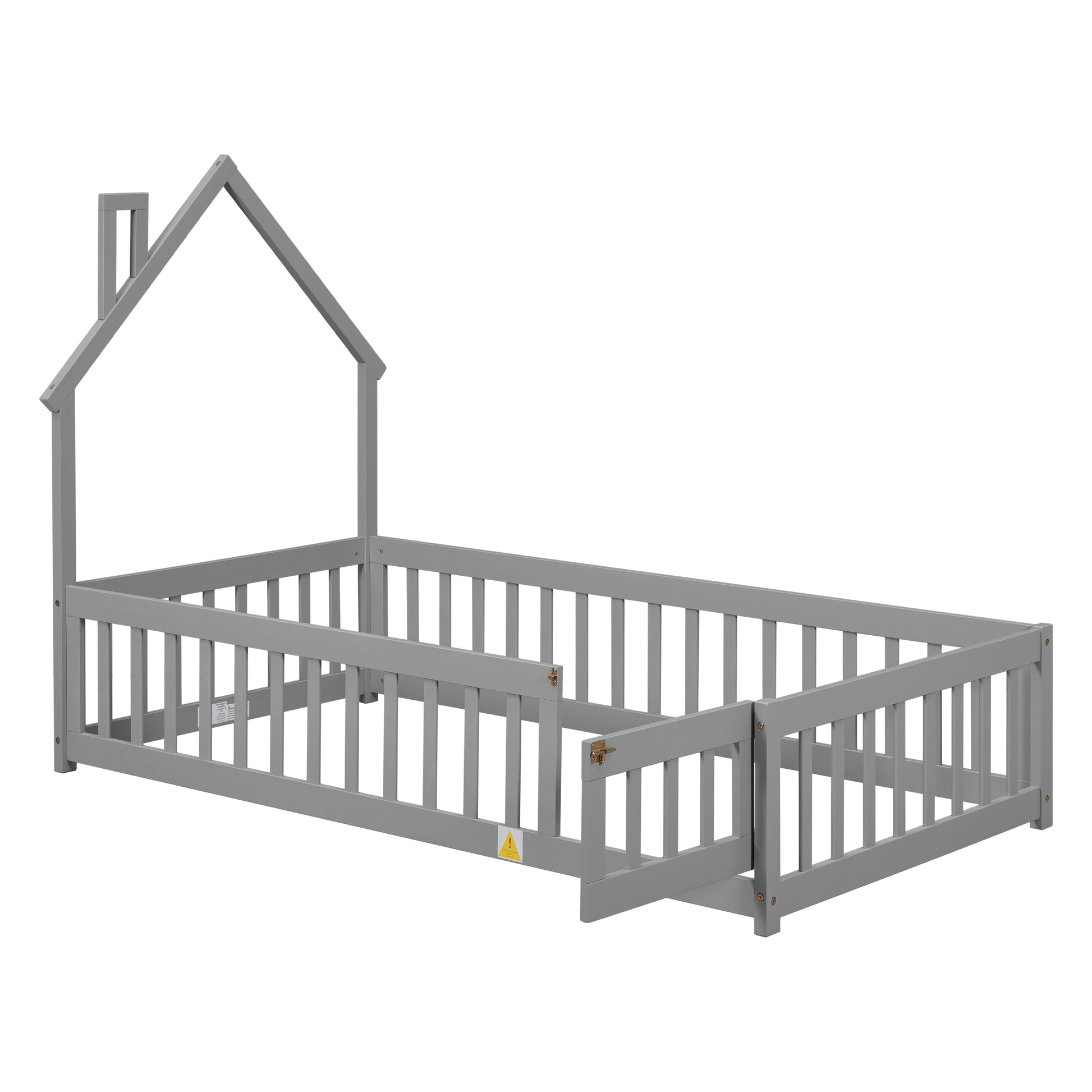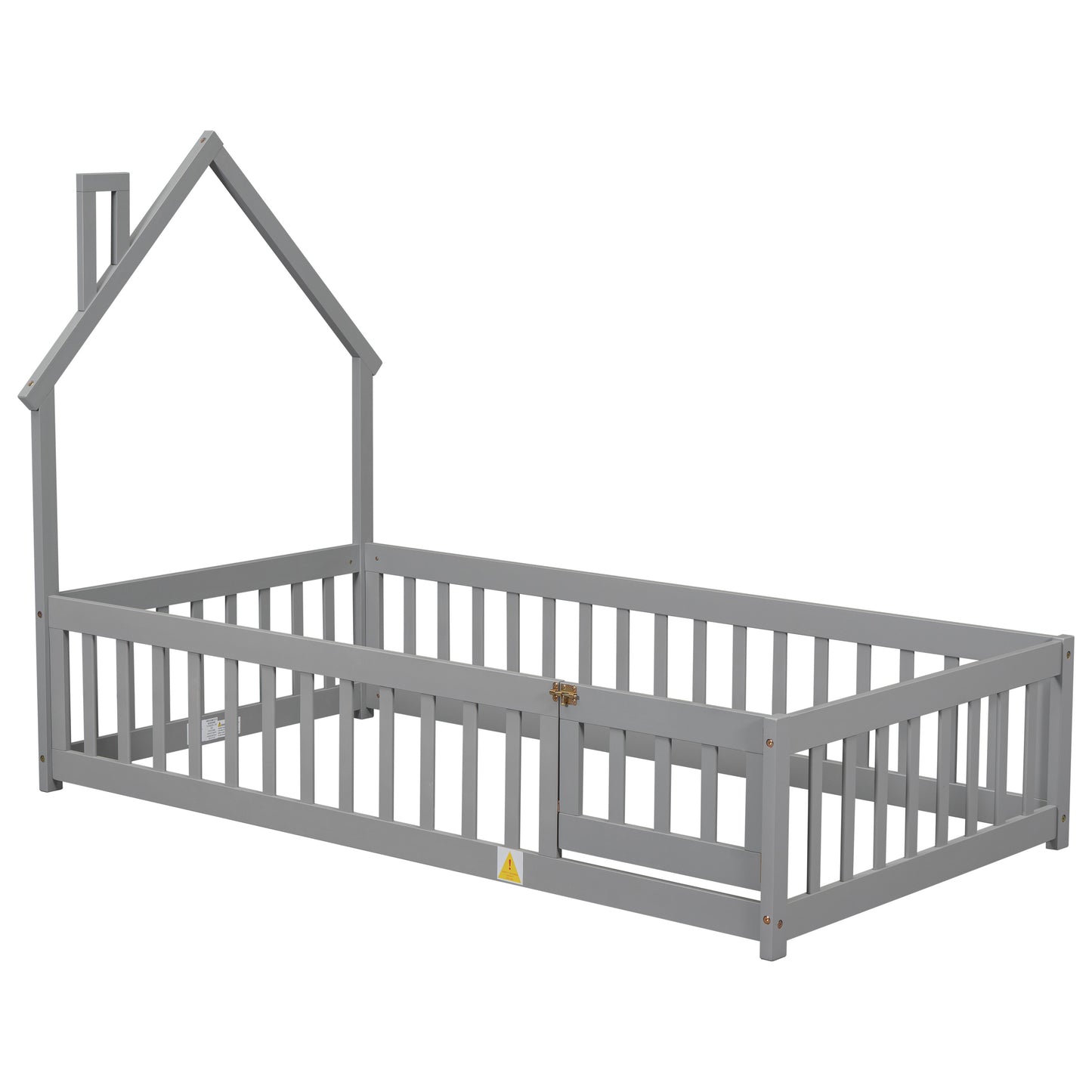 Twin House-Shaped Headboard Floor Bed with Fence,Grey