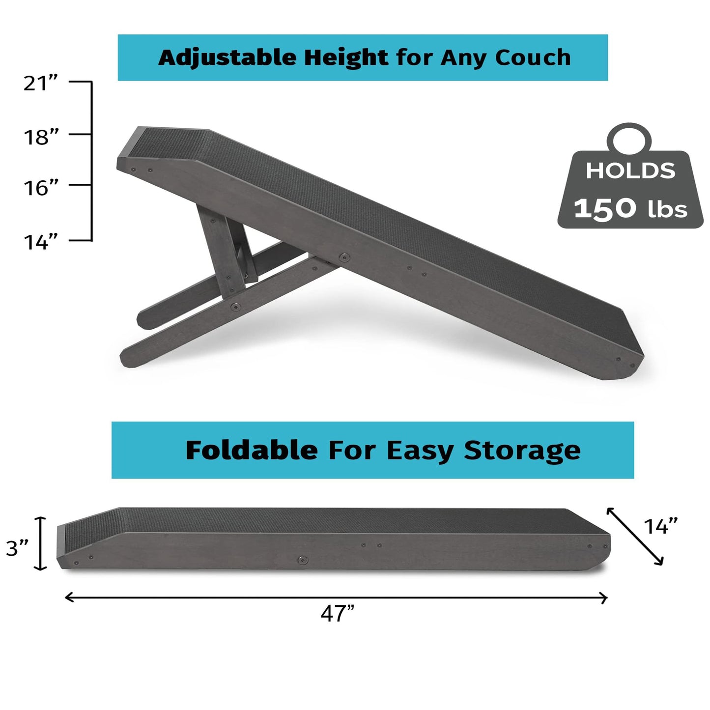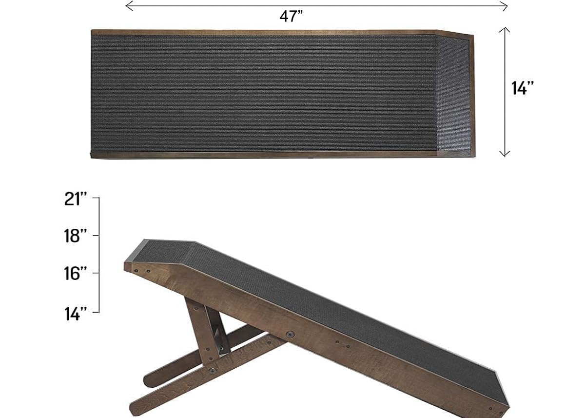 - PLEASE MEASURE FIRST to avoid an unnecessary return. This dog ramp is 14" wide and 47" long, our adjustable dog ramp has 4 height intervals adjusting from 14" to 24". Weight: 15lbs. Holds dogs up to 100lbs.
