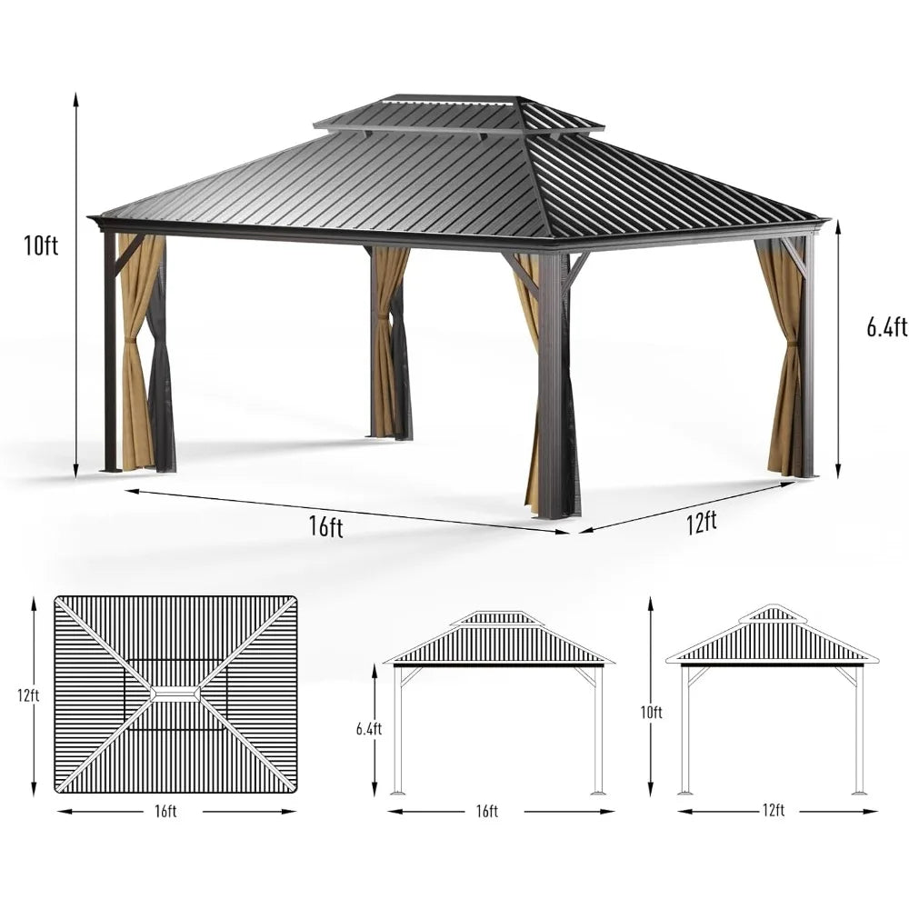 - 🕍GALVANIZED DUAL ROOF: The galvanized roof can help this outdoor gazebo withstand heavy snow & wind and also reflect harmful UV radiation. The double-roof eventilated gazebo 12*16 ensures air circulation and gives you a hint of cool in summer. The two hooks built-in roof allow you to hang lights or other decorations for added comfort.