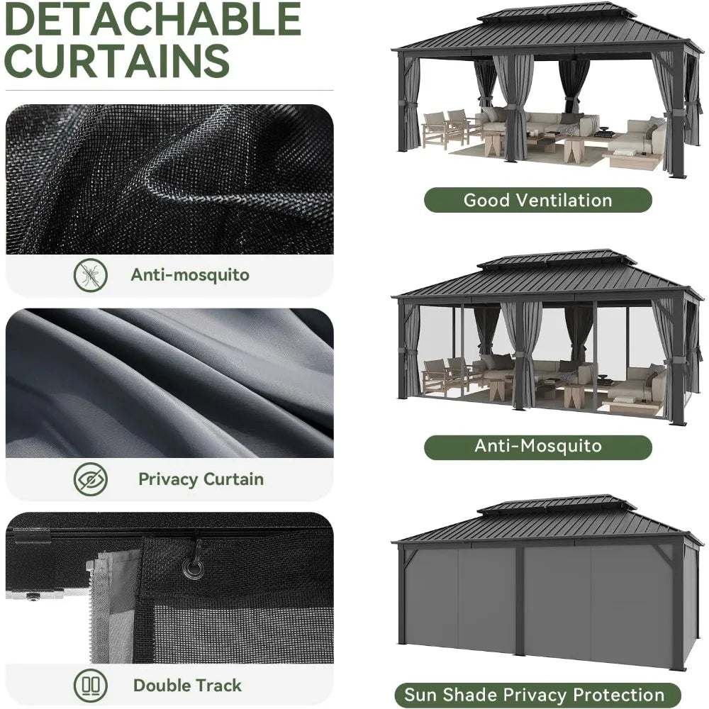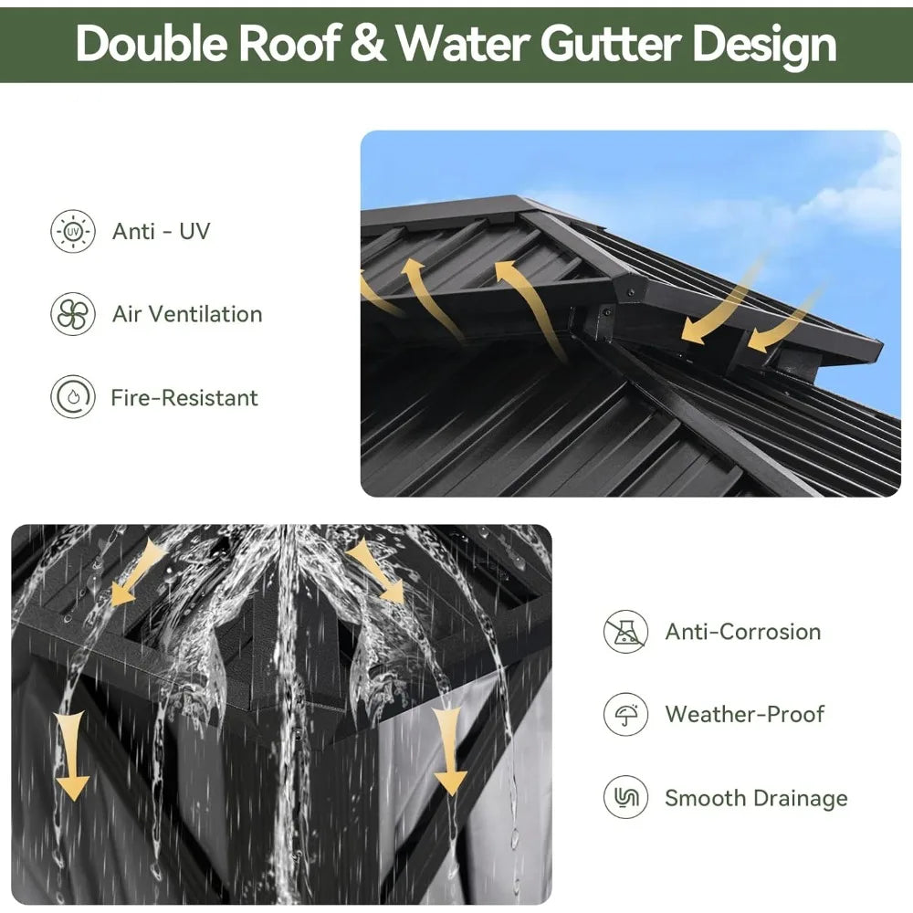 - -🏖️UV Blockieren Dual-layer Galvanized Board: The double-layer hard-top pavilion has three protective layers. The heat insulation layer can block most sunlight and reduces heat. It is double-layer water leak proof and can be used all-weather. Reasonable roof slope design can also make water flow out quickly to prevent rainwater from gathering.