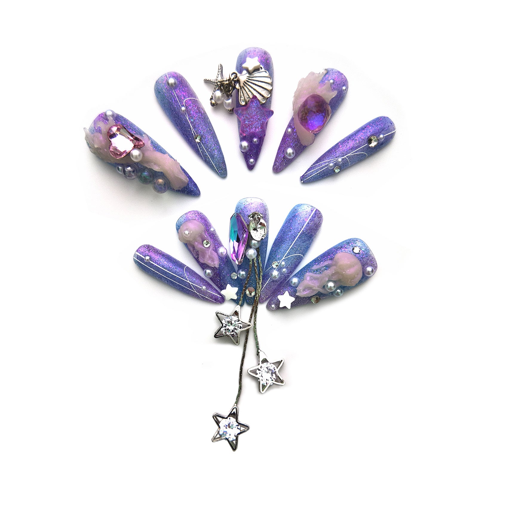 Luxury Handmade Press On Nail Baroque Style Long Pointed Nails with Diamonds, Acrylic, Faux Nail Set for Women(Mermaid's Dream, Large)