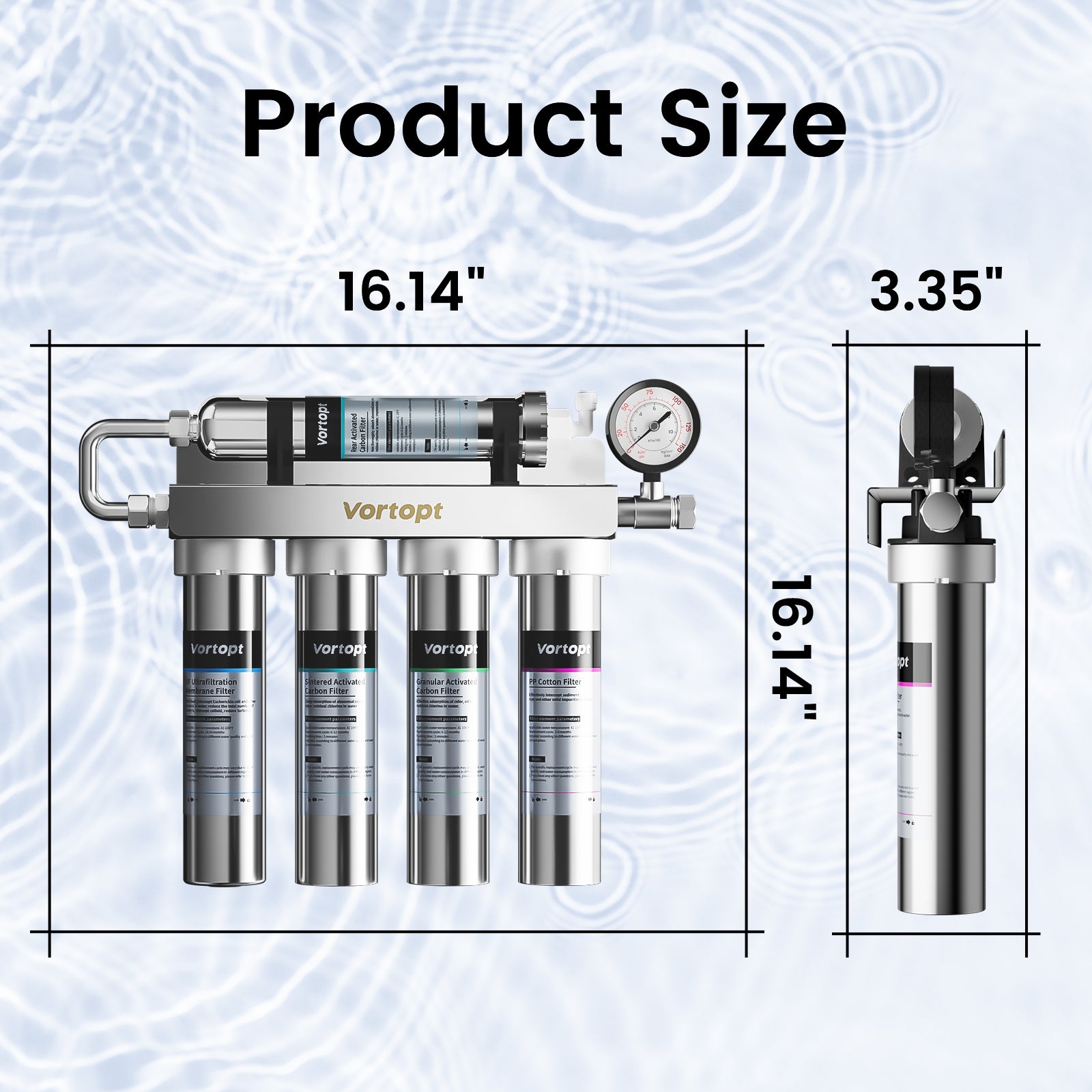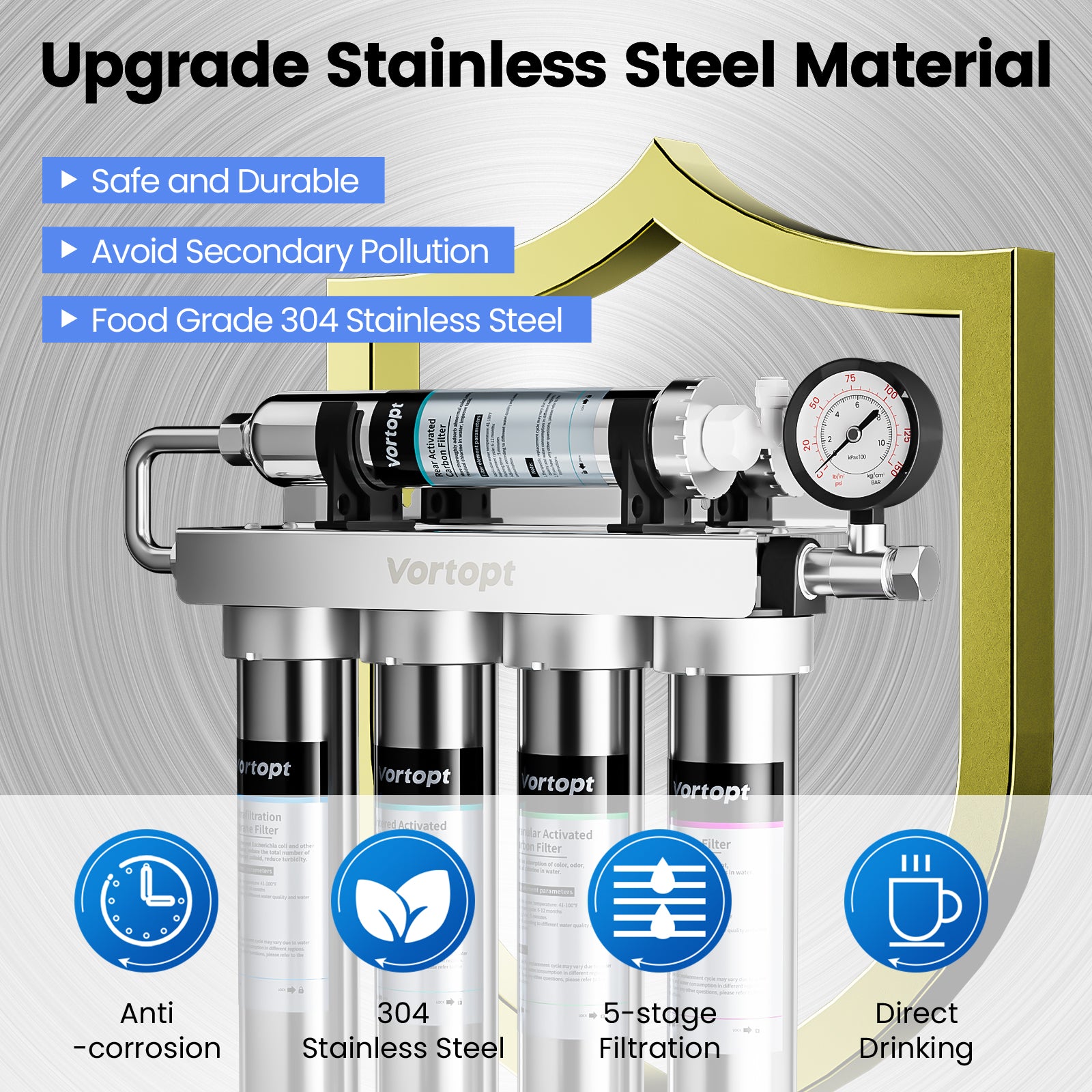 - 【High-quality stainless steel material】 Vortopt undersink water filtration is made of food-grade 304 stainless steel, which is also durable and easy to clean. This sleek stainless steel design of this water filter system ensures durability and longevity, making it a stylish and practical addition to any kitchen.
