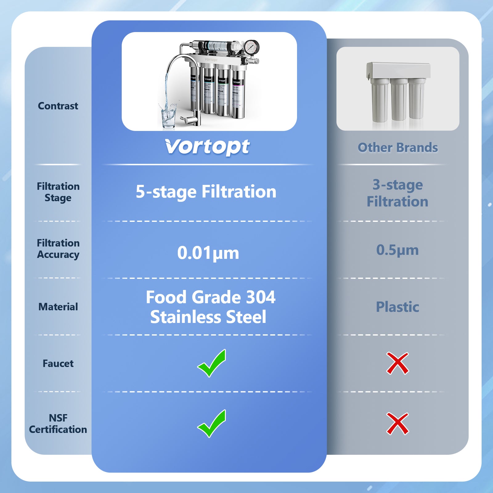 - 【5-stage filtration】 With 5-stage filtration level , Vortopt under sink water filter provides the most comprehensive protection for your family. This water filter can effectively adsorb abnormal color and odor and remove impurities, including chlorine, lead, sediment, and other particles larger than 0.01μm. With a rear-mounted carbon rod filter element that improves taste.Enjoy clean and fresh drinking water now!