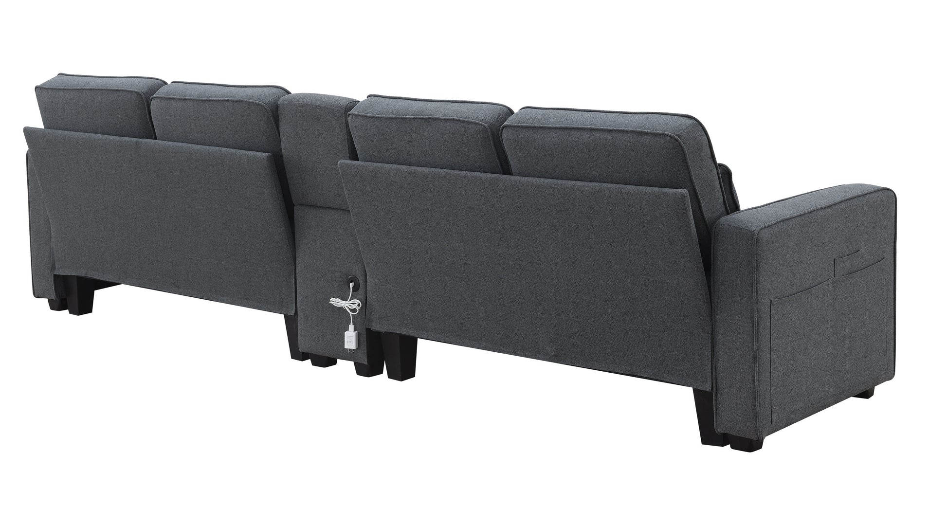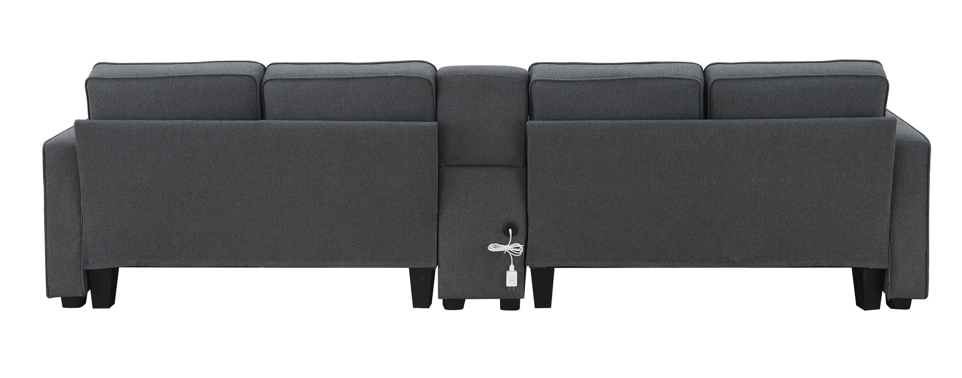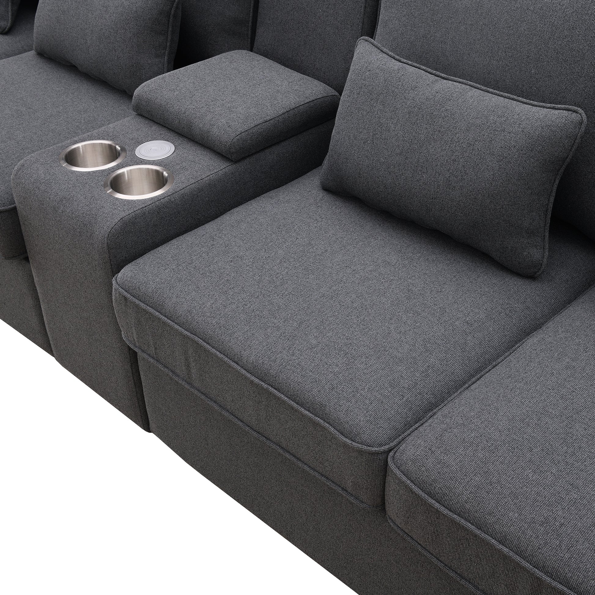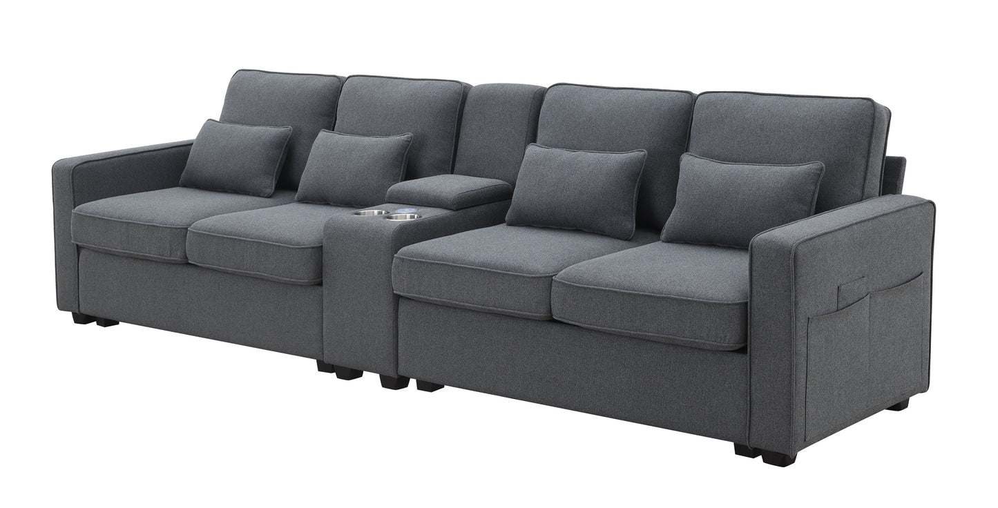 114.2" Upholstered Sofa with Console, 2 Cupholders and 2 USB Ports Wired or Wirelessly Charged, Modern Linen Fabric Couches with 4 Pillows for Living Room, Apartment (4-Seat)